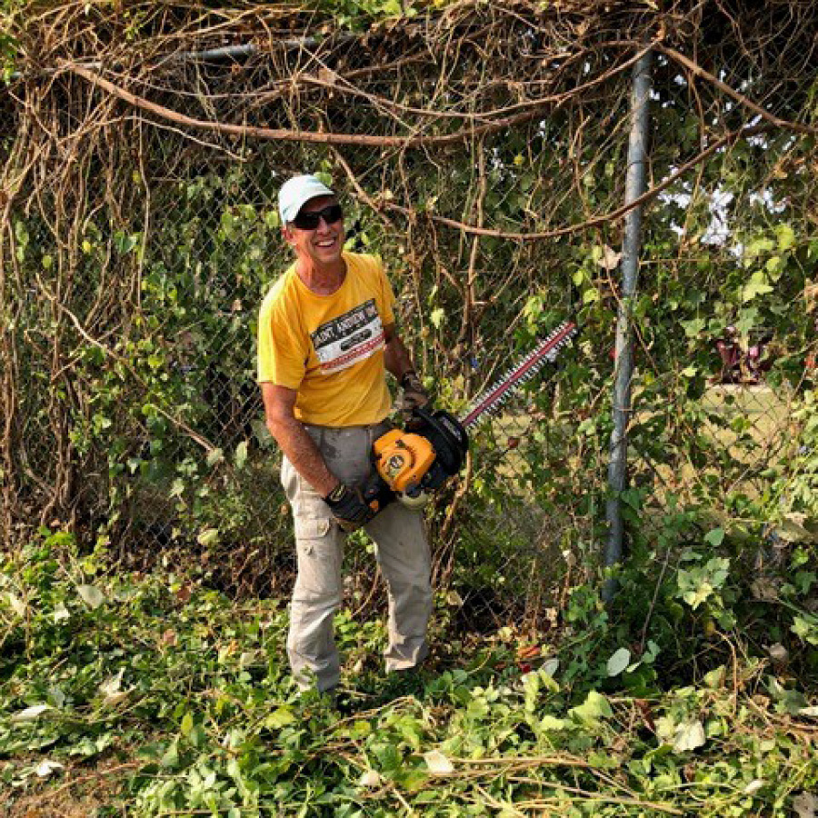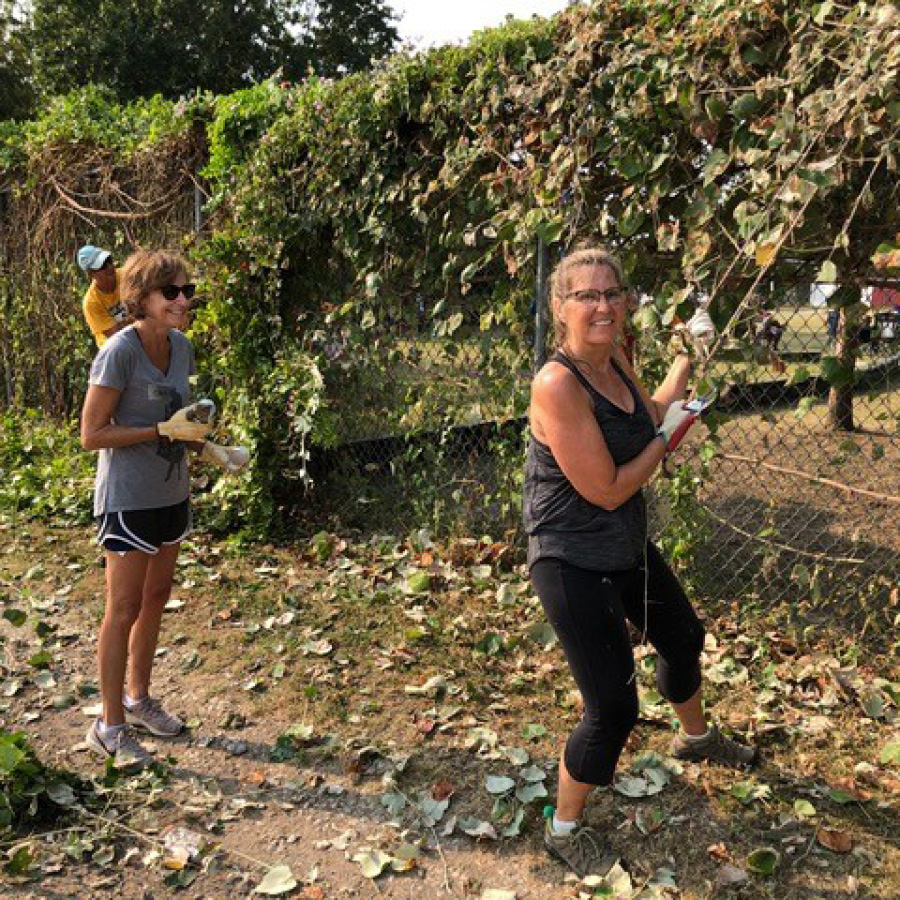 Recently St. Andrew United Methodist Church in Plano sent a team of 12 volunteers to tackle a large pruning project on our campus. This delightful and hardworking group worked in the heat for over 3 hours cleaning the bushes, vines, and trees in the alleys surrounding our athletic fields. With their chainsaws and clippers, they filled up two dumpsters which were donated by Gold Metal Recyclers. After the cleanup, St. Andrew UMC provided a BBQ lunch which was enjoyed by the volunteers as well as many of our neighbors. Thank you so much to our friends at St. Andrew UMC for their commitment to St. Philip’s and the community!