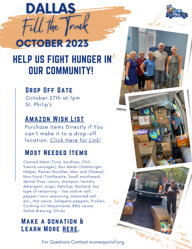 We invite you to be a part of something truly meaningful. On October 27th at 1 pm, we will be hosting our Dallas Fill the Truck event at St. Phillips, and we need your support to make it a success.