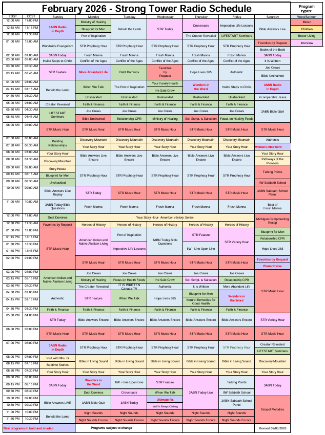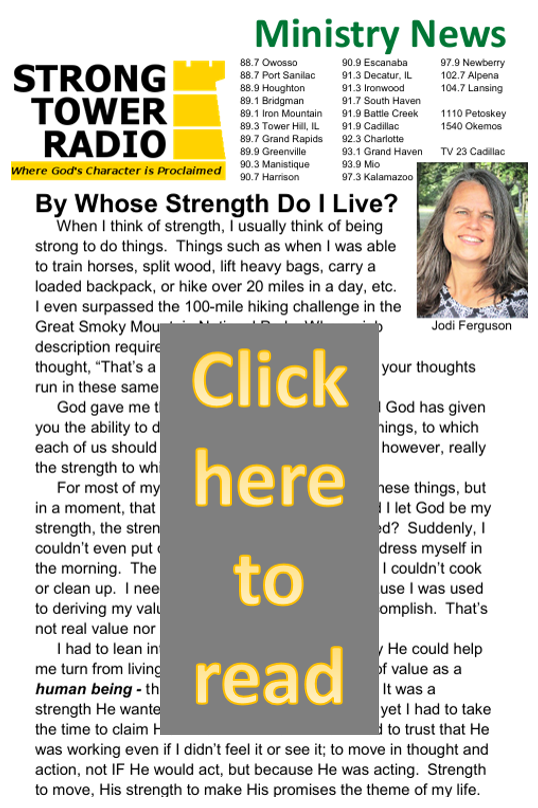 STR airs Fresh Manna sermons, streaming at StrongTowerRadio.org, STR.fm, and STR's local stations, Monday through Friday, at 2 am and 11 am.