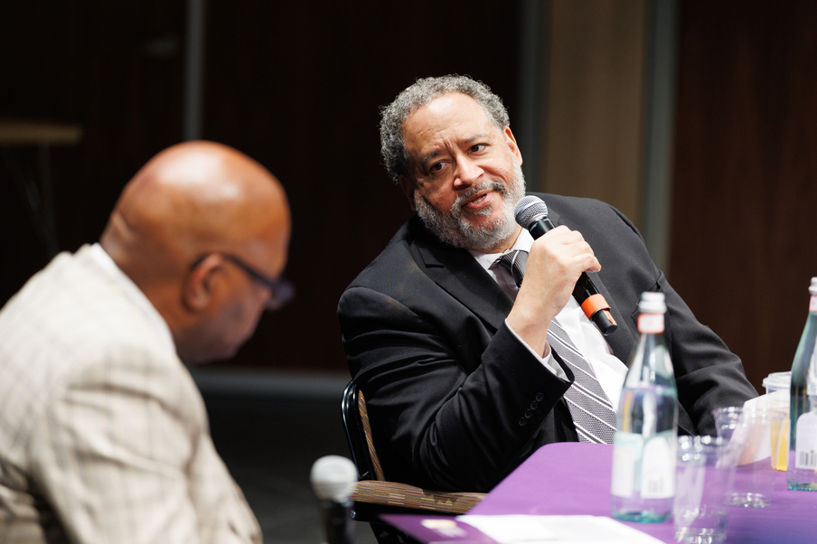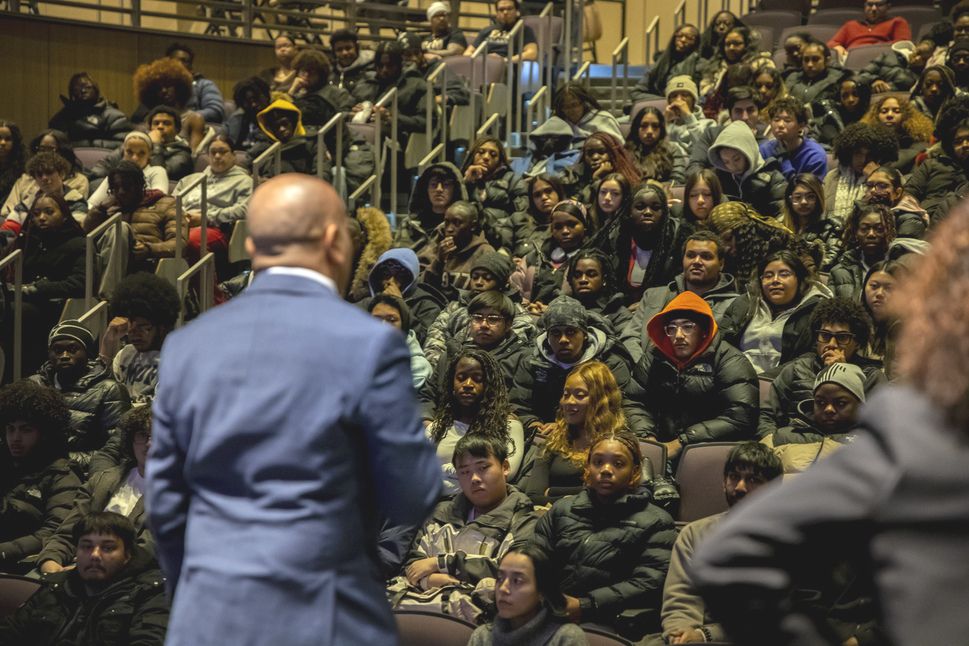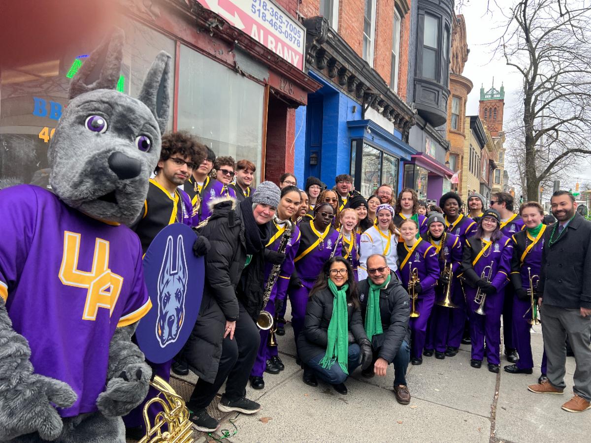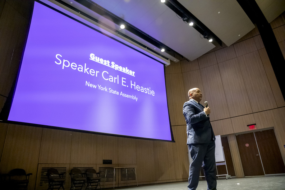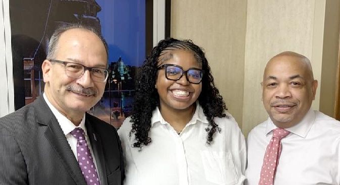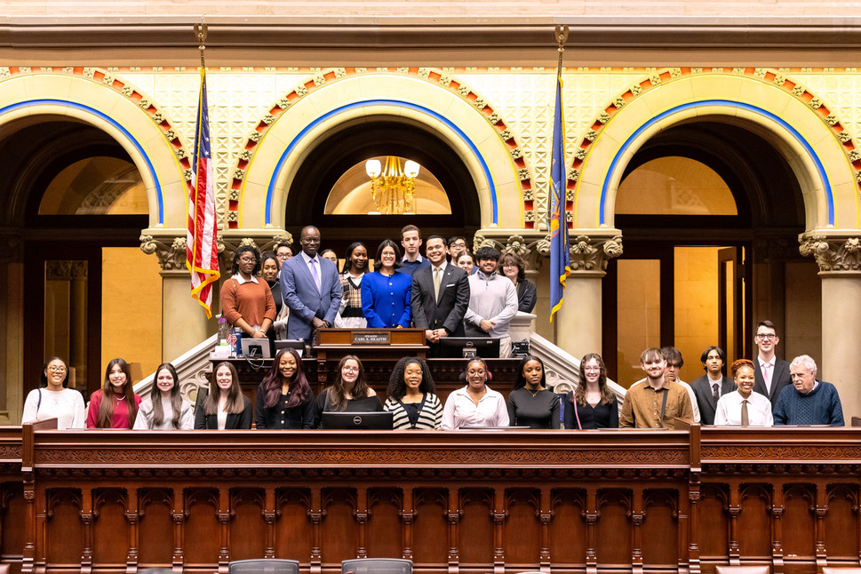 (Below) President Rodríguez and Assembly Speaker Carl Heastie pose for a photo with UAlbany senior Irelsa Arauz Harry. Irelsa is an intern in the speaker's office.
