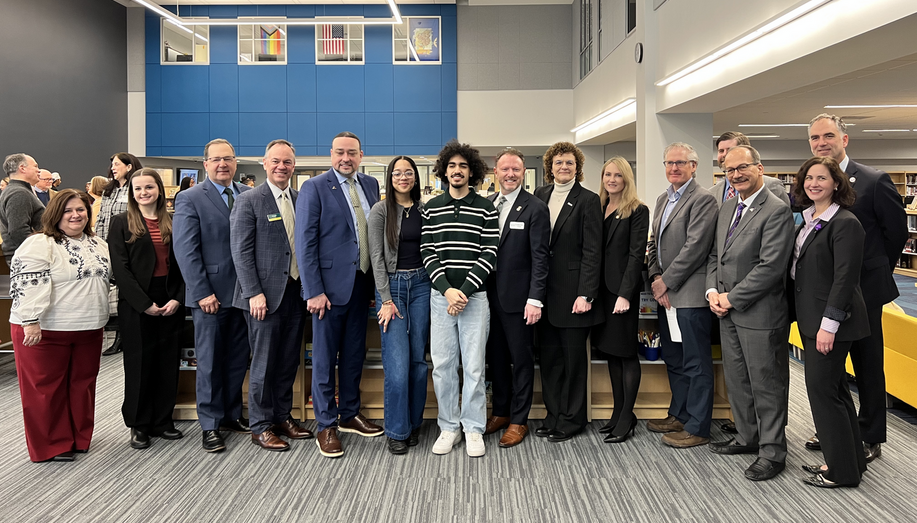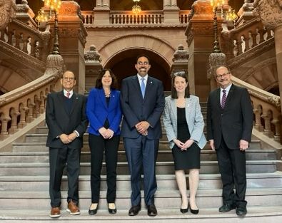 (Above) SUNY leaders gather on the NYS Capitol's Great Western Staircase. (From left) University at Buffalo President Satish Tripathi, Stony Brook University President Andrea Goldsmith, Chancellor John B. King Jr., Binghamton University President Anne D’Alleva, and UAlbany President Havidán Rodríguez