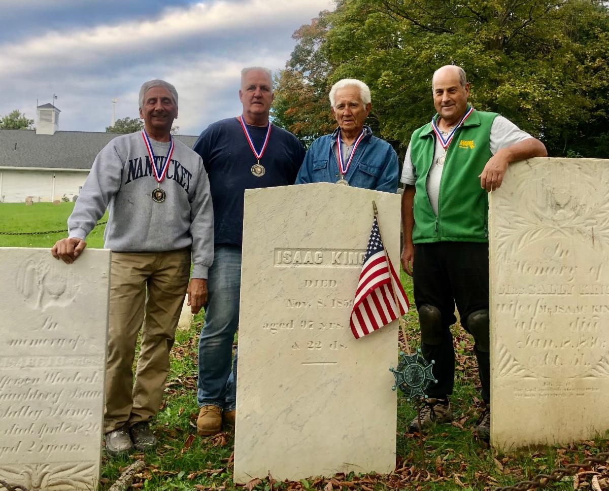 Volunteers from the BHC Cemeterery Conservation Ambassadors at the Sutton Historical Society proudly stand with the reset and newly cleaned headstone of Isaac King, a Revolutionary War Veteran. Pictured left to right are David Pizzi, Brian Stevenson, John Belculfine, and Ross Weaver.