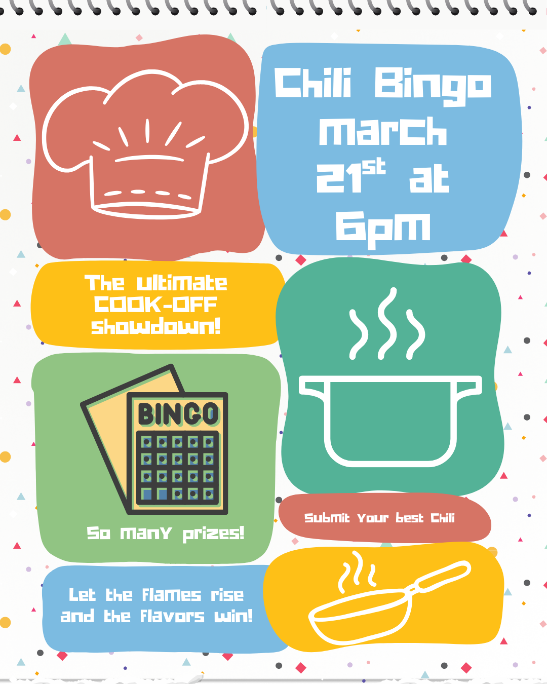 March 21 - Chili Cook Off/Bingo Night (6-8 pm in Sanctuary Hall)