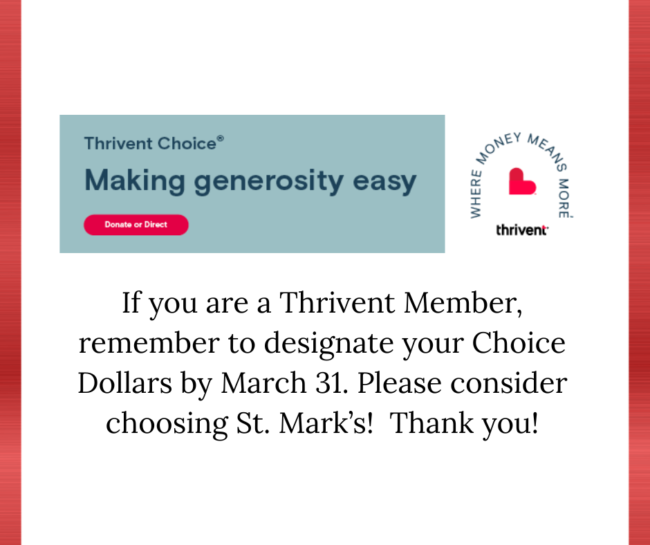 For some of us, this will be a new name; for many a familiar valued series of insurance and financial services provided primarily to Lutherans. But did you know that Thrivent also Gives Back? Over the next few weeks we will be providing information to better acquaint you to Thrivent and what it offers to you, to St. Mark’s and to our community.