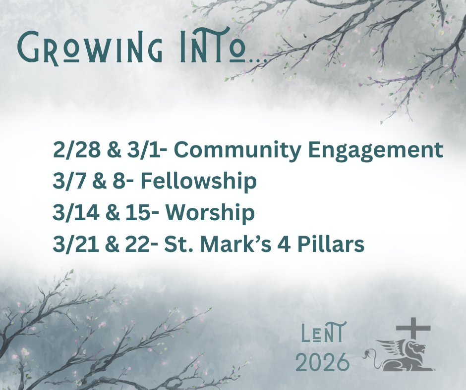 This Lent, Deacon Dave and Pastor Krista will be doing a sermon series on our four mission pillars: Spiritual Growth, Community Engagement, Fellowship and Worship. These are our priorities on how we live into our mission statement; "Sharing Christ's abundant love with each other and the world." These were identified by the congregation during the "What's Possible" process in 2024 and adopted by the congregation in January 2025. When Pastor Krista and Deacon Dave were called to serve St. Mark's they affirmed these priorities. Now, we are growing into these priorities as a congregation. How is God calling us to live these out? Join us this Lent as we discern and grow together. There will be some opportunities for everyone to contribute their ideas and creativity. Keep an eye on the narthex.