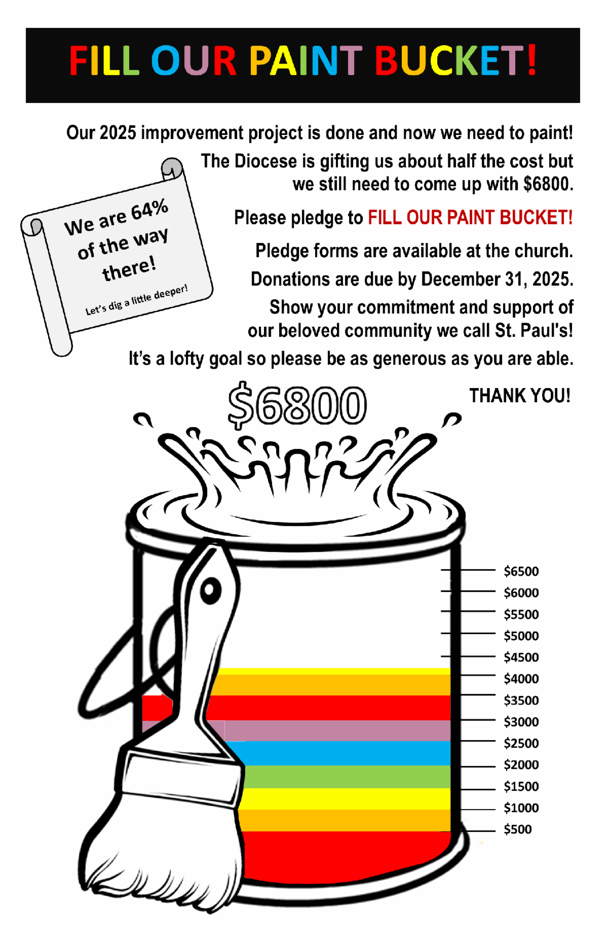 We are officially wrapping up our summer fundraising drive THIS SUNDAY. Ten generous pledges were made, raising $4,330 toward our goal of $6,800, attaining approximately 64% of our goal. Remember we received $5,200 from the diocese to assist in the $12,000 paint project. We are grateful for all those who made a personal sacrifice to pledge. Thank you! And if you haven't made a pledge, please consider doing so. It's really never too late. Just drop a check in the collection plate, or in the mail, with a note in the memo section "for the summer fundraiser." Those who consistently watch our service on-line, we'd love for you to make a financial gift toward our efforts. Anything and everything is appreciated!