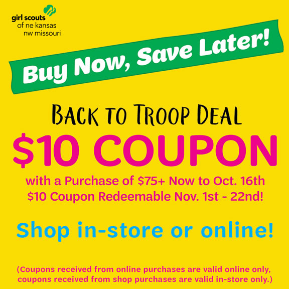 Earn a $10 coupon* when you spend $75+ now through Oct. 16 at the Girl Scout Shop! Shop online or in-store, but please note that your coupon can only be redeemed at the place of purchase (ex: in-store earned coupons cannot be used online).