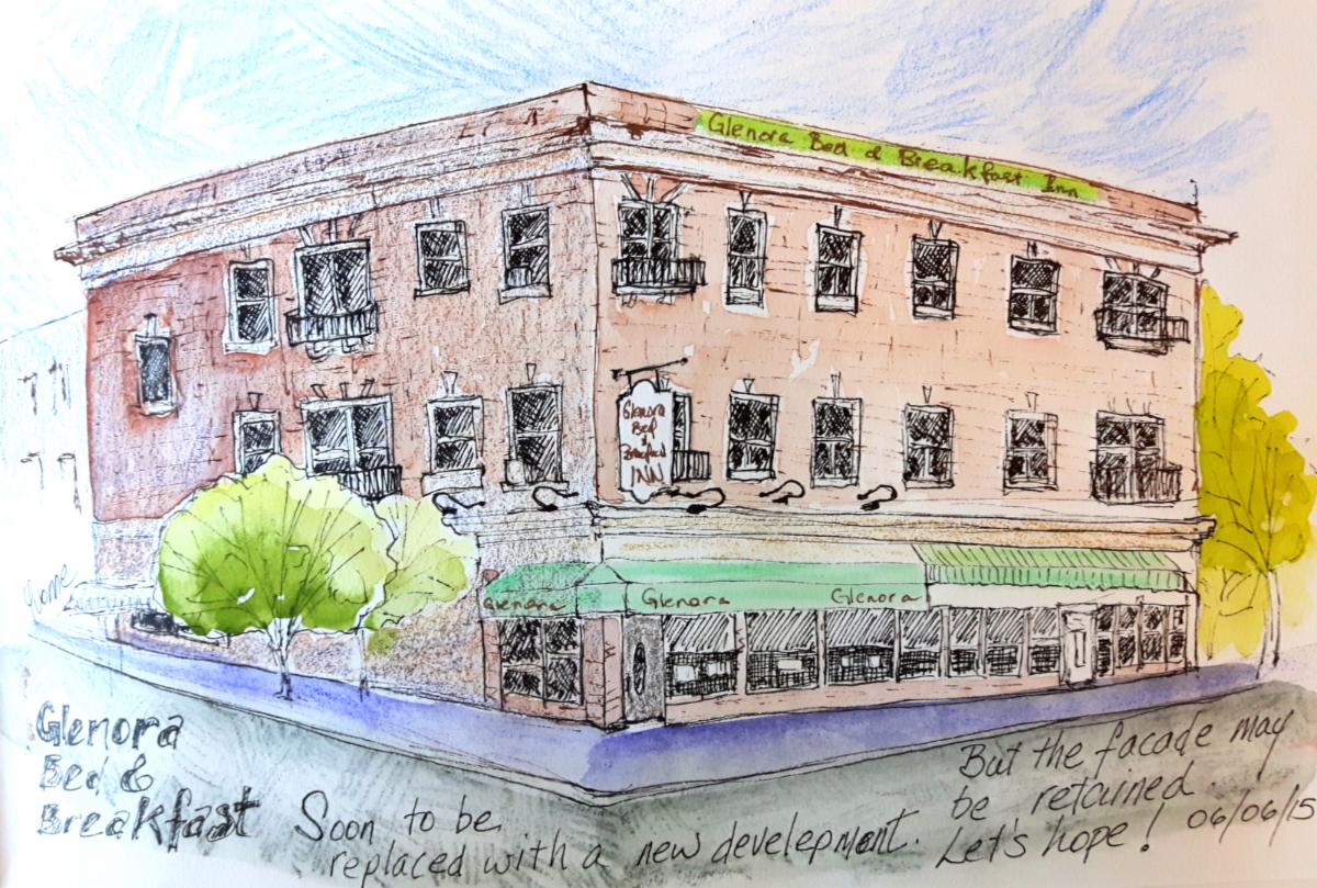 Buildings featured in the exhibit include the Hotel MacDonald, the Owen Residence in the Highlands neighbourhood and the Glenora Bed and Breakfast. Each piece includes a sketch and information about each building’s history.