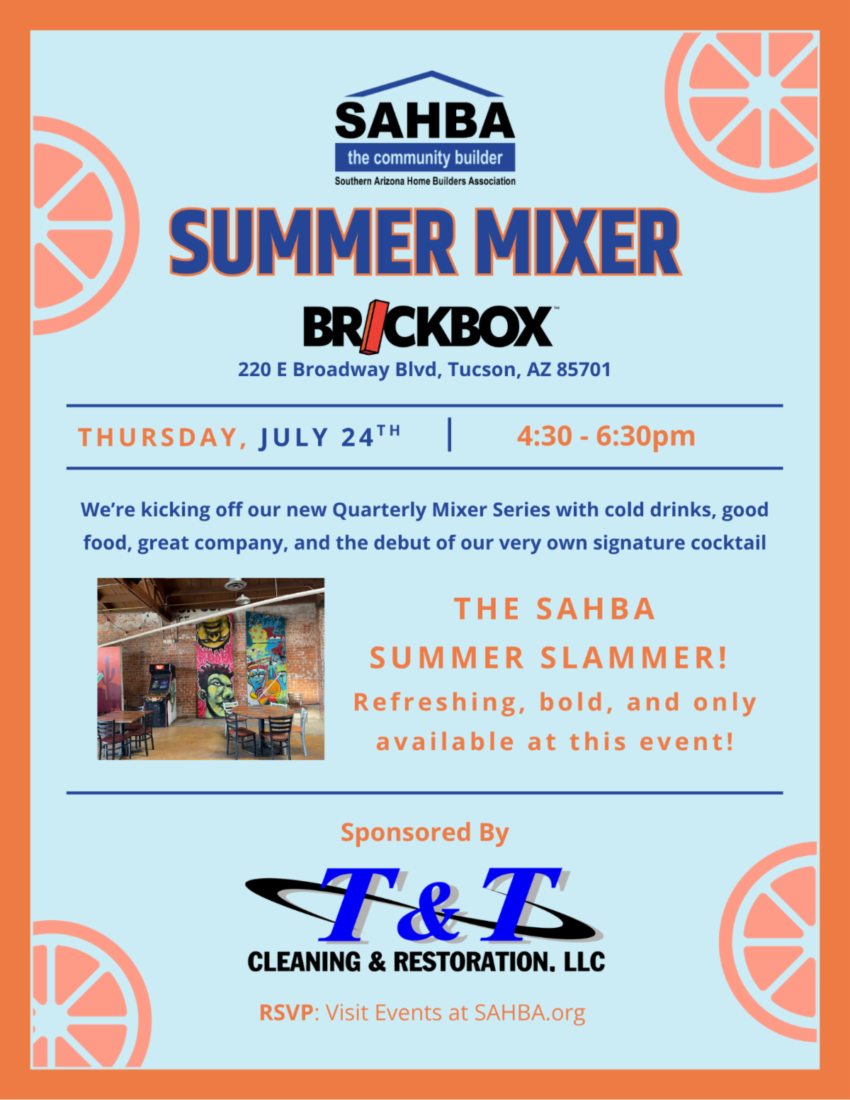 Join us for our FREE summer mixer, sponsored by T & T Cleaning, with cold drinks, good food, great company and the debut of our signature cocktail - the SAHBA Summer Slammer!
