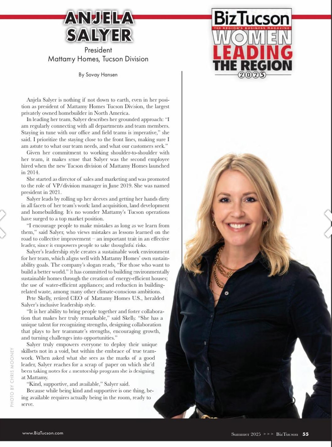 Mattamy Tucson Division President, and SAHBA 1st Vice Chair, Anjela Salyer has been recognized as one of the "Women Leading our Region" by Biz Tucson. Salyer, who is well known throughout our membership and industry, epitomizes this distinction. She's always one to step up and lead on key homebuilding and community issues. On behalf of SAHBA, "Congratulations"!