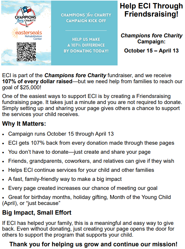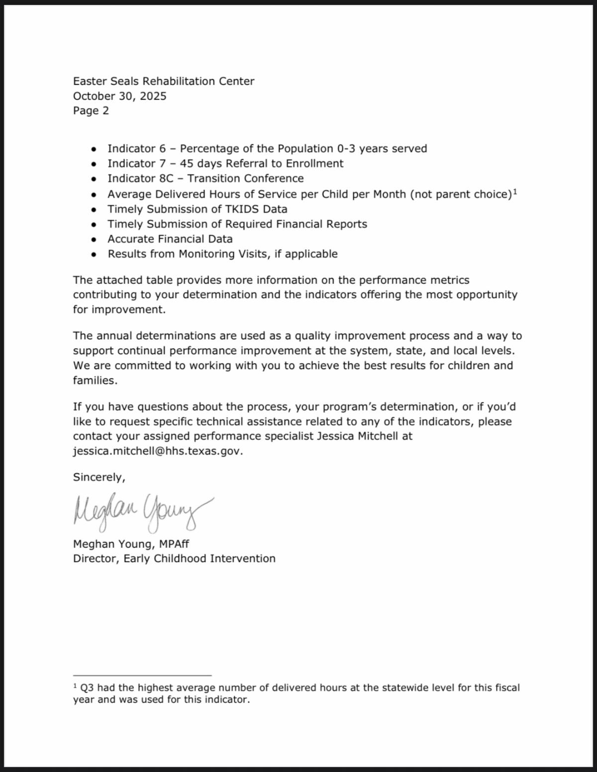 We’re proud to share that Easterseals’ Early Childhood Intervention (ECI) program received the highest possible performance determination from the Texas Health and Human Services Commission (HHSC)! Each year, under Section 616 of the Individuals with Disabilities Education Act, HHSC evaluates local ECI programs—and this recognition reflects our team’s outstanding commitment to quality services and positive outcomes for children and families. | | | |