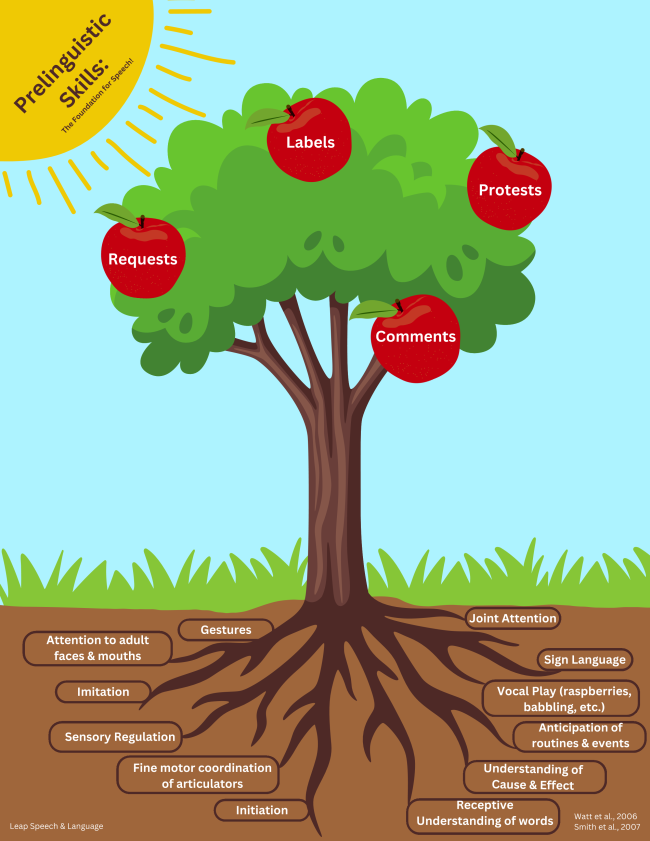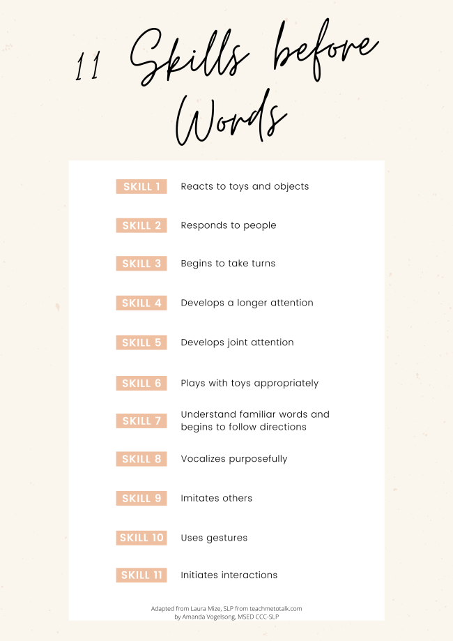 These visuals (click to zoom) depict the prelinguistic skills children need to have before words emerge. | |