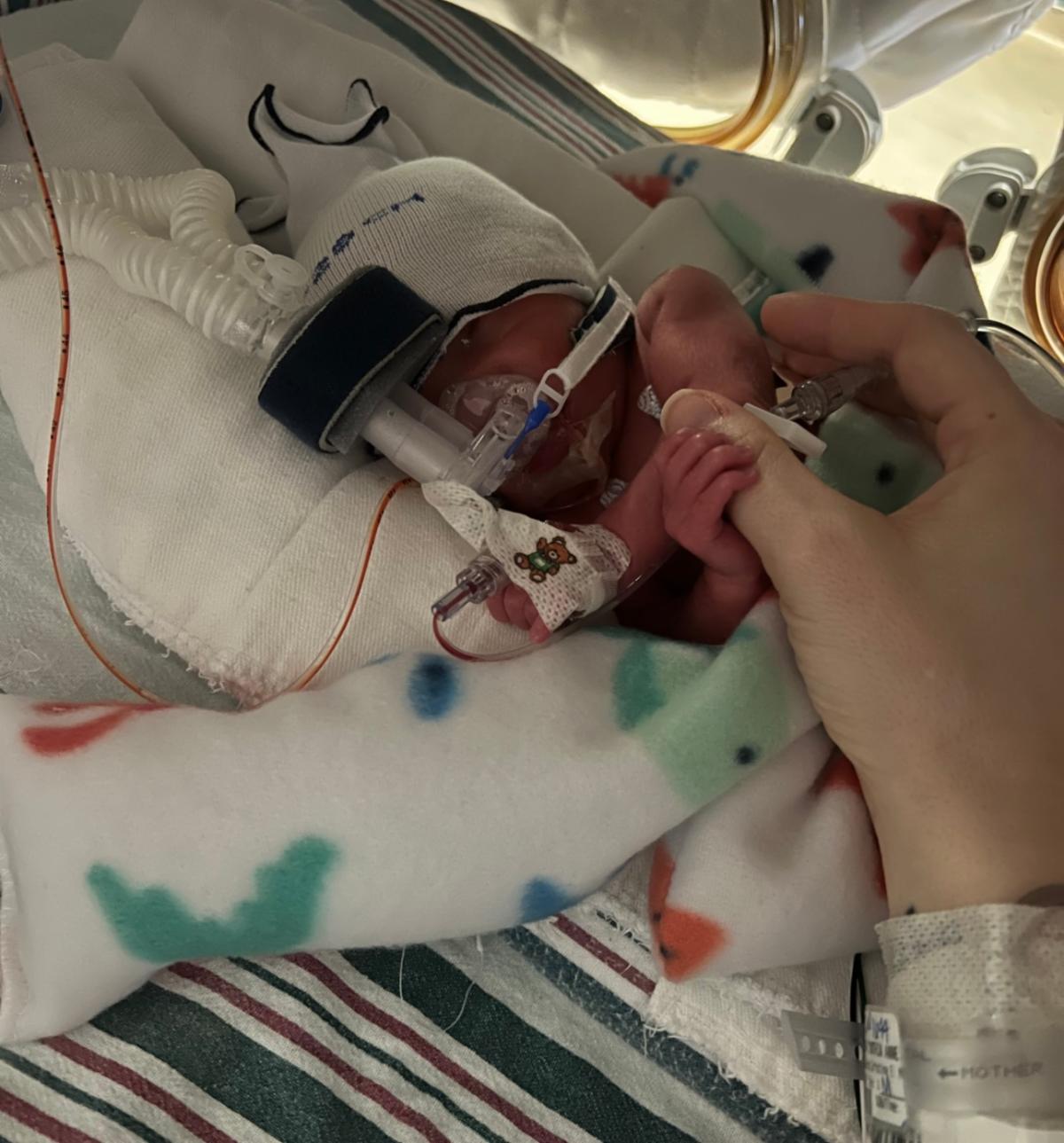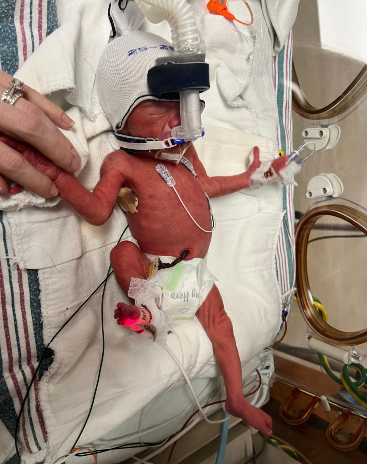 Our sweet boy was born on March 31, 2022, at 30 weeks and 1 day. He tried coming at 27 weeks and again at 29 weeks, but thankfully through magnesium and steroids, we were able to make it as far as we could before things just couldn’t be stopped. Benjamin arrived at 4:44 pm weighing in at 3 pounds 6 ounces and a whole 16 inches long! Our labor was traumatizing, to say the least and our sweet boy proved to us just what a fighter he was! Little did we know just how strong he was and would prove to be. The night we were scheduled to room in, he developed late-onset GBS and meningitis and crashed on us, requiring him to be intubated and put on 100% vent support to keep his little but mighty body fighting. He prevailed and came home after a 3-week course of heavy antibiotics. After being home for 3 weeks, he became sick again. I knew based on his cry alone that horrific night that something was wrong and we took him to the emergency department. They initially scoffed at me for bringing him in for “doing the same cry he did when he had GBS the first time.” However, my momma instincts were right and within 10 minutes of being in the ED, he crashed on us and had to be intubated again.