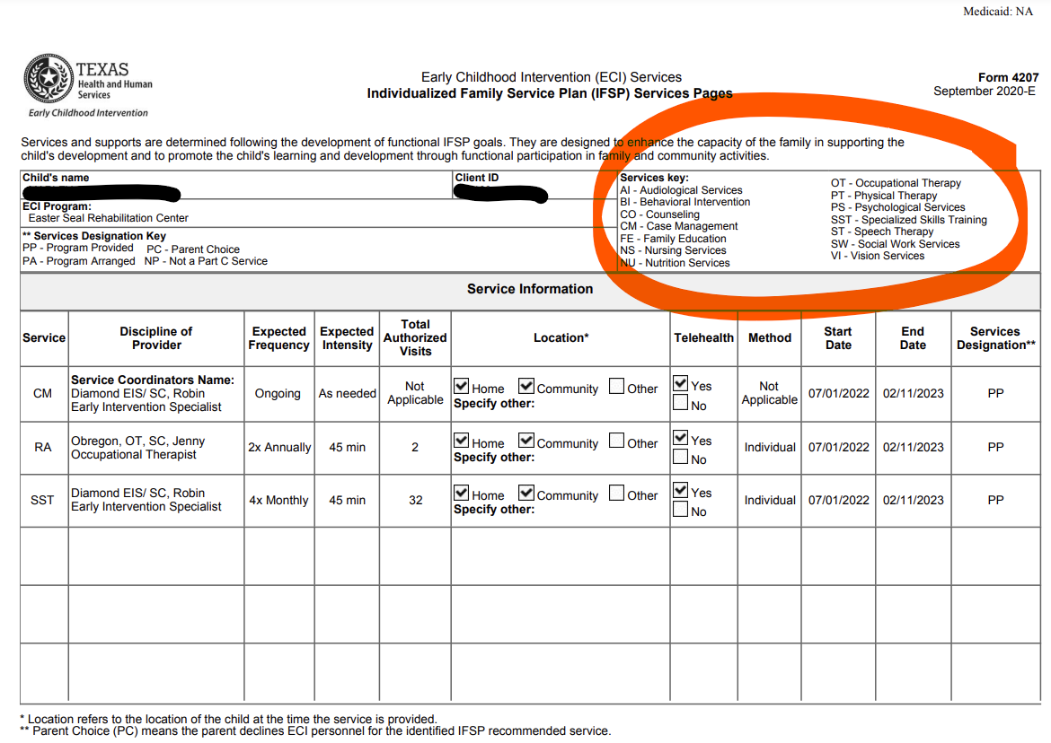 · Services our ECI program will provide to you and your child and includes the frequency as well as the length of each service; and
