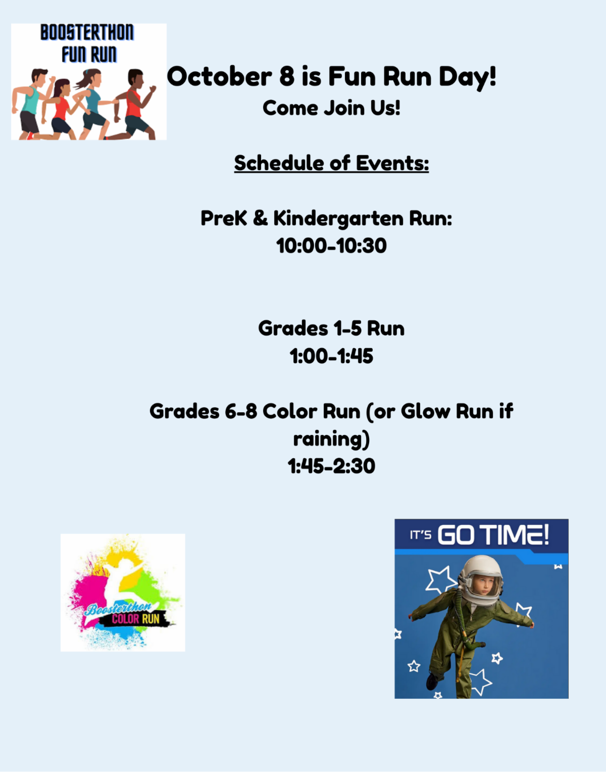 October 8 is our Fun Run day. Our Boosterthon team will be on campus to work the event in the courtyard. If it rains the event will be moved to the gym. Our current schedule is: