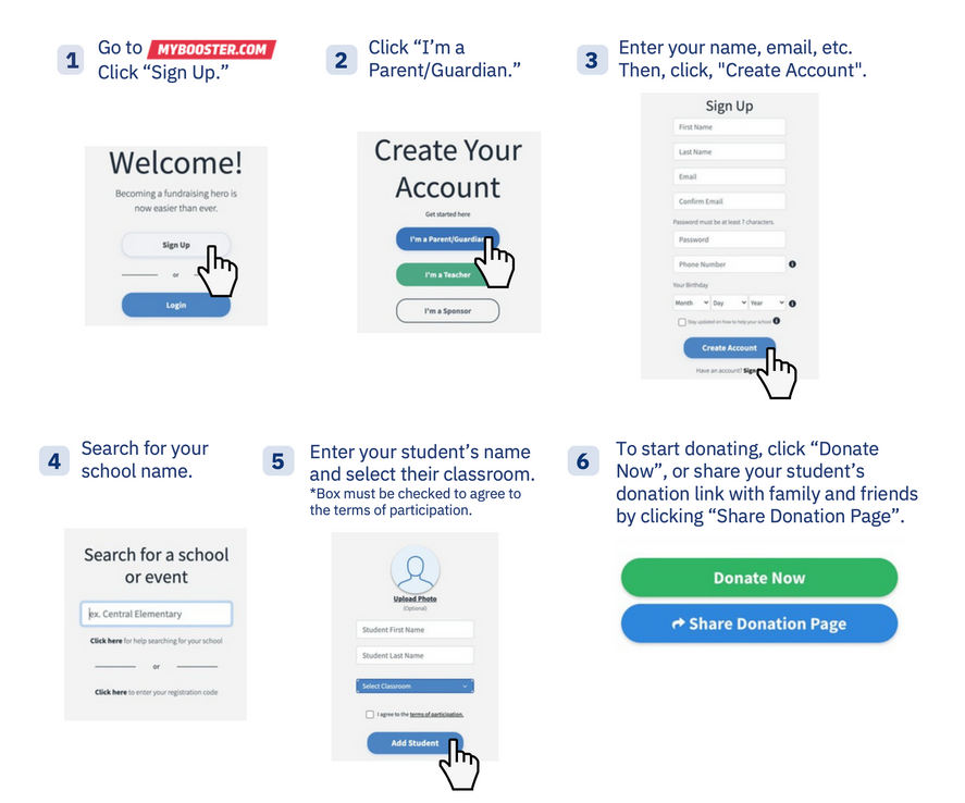Families will gather donations through MyBooster.com by simply sharing your student’s page link with friends and family. Every share makes a difference!