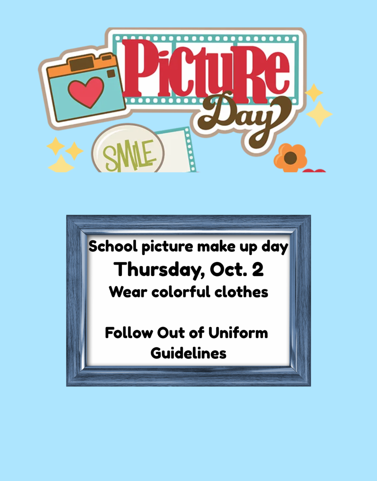 For the Middle school run, theirs will be a "color run." Students should wear old clothes for this event, as onlookers will be able to toss colorful powdered chalk toward the students (yes, it should wash out). If it rains, we will switch to a "glow run" in the gym. We encourage parents to attend the Oct. 8 Fun Run events. You can even participate with your child if you'd like. We want this to be a fun, team building event for our school.