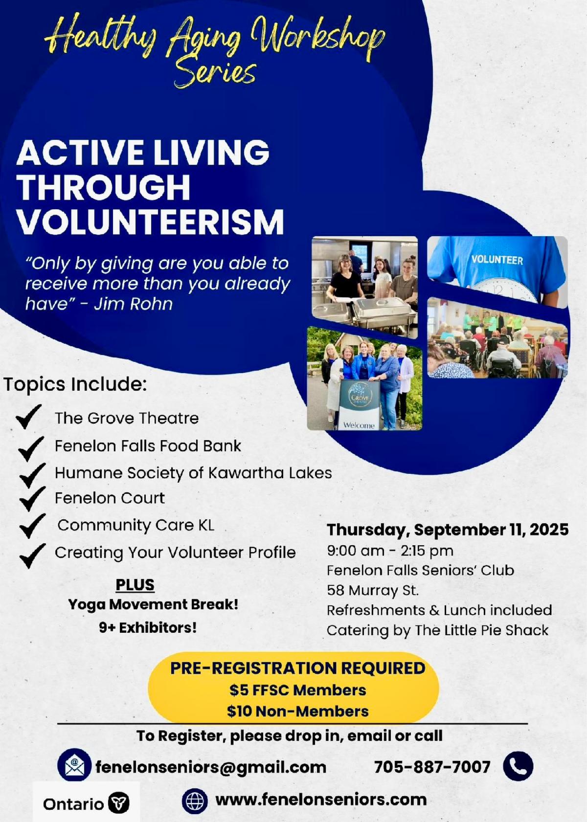 Community Care is excited to be joining the Fenelon Falls Seniors’ Club Workshop on Wednesday, September 11, from 9:00 a.m. to 2:15 p.m. This event brings together several community partners to share resources, information, and ways to get involved.