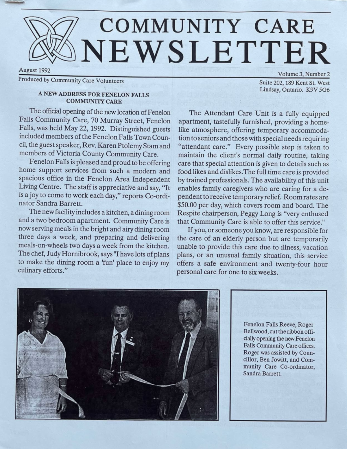 In August 1992, we celebrated the grand opening of our new Fenelon Falls Community Care office that year at 70 Murray Street. The new location featured a kitchen, dining room, and a two-bedroom Attendant Care Unit, offering a warm, home-like environment for temporary care. Meals on Wheels and in-house meal service were also in full swing, thanks to chef Judy Hornibrook and a dedicated team.