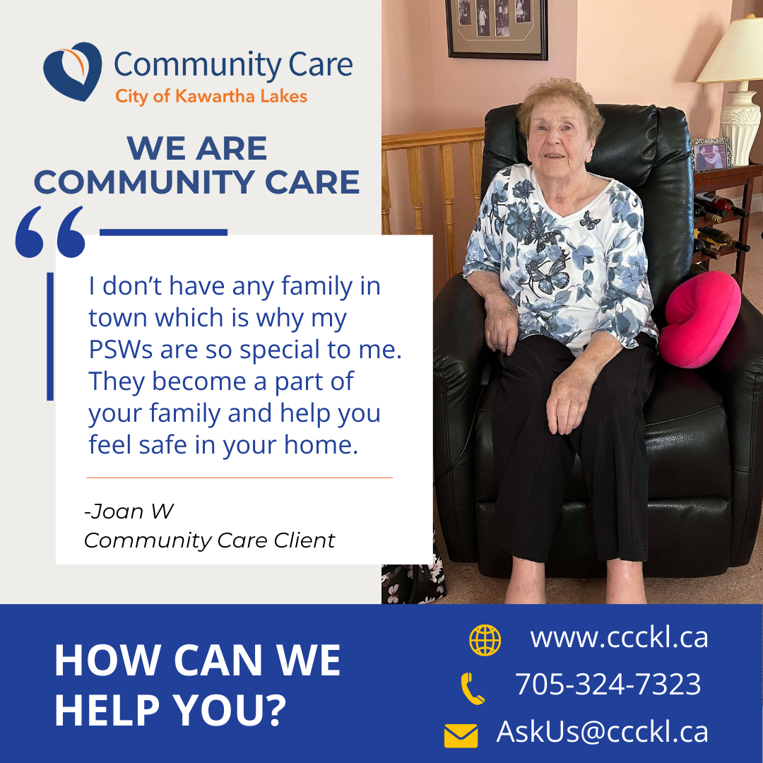 For the past 10 years, Joan has been a client of Community Care City of Kawartha Lakes (CCCKL), a connection that began after a fall landed her in the hospital. It was her son-in-law who first reached out to CCCKL, recognizing that Joan needed extra support as she faced challenges with her mobility.