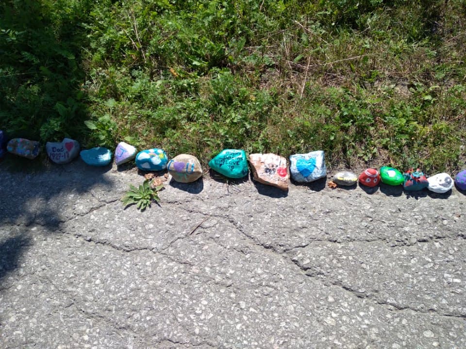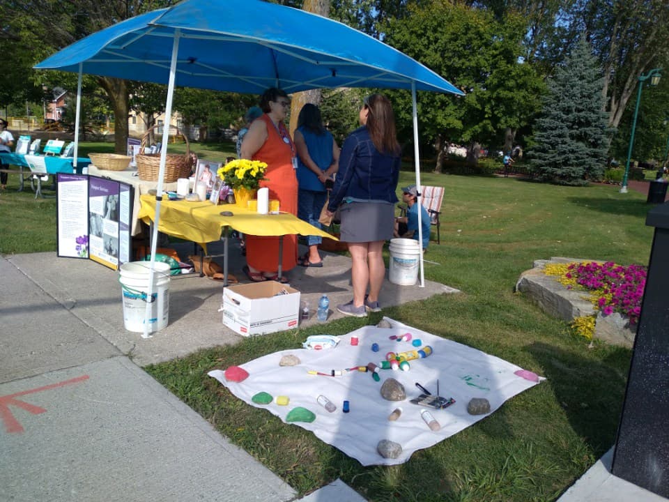 Anyone that visited the Saturday Lindsay Farmer’s Market on Saturday September 10th had the opportunity to learn more about our monthly support group for those who have been affected by suicide loss. Members of the public were asked to paint rocks in memory of their loved ones. The rocks were then taken to the Rotary Park Rock Snake and added to the row.