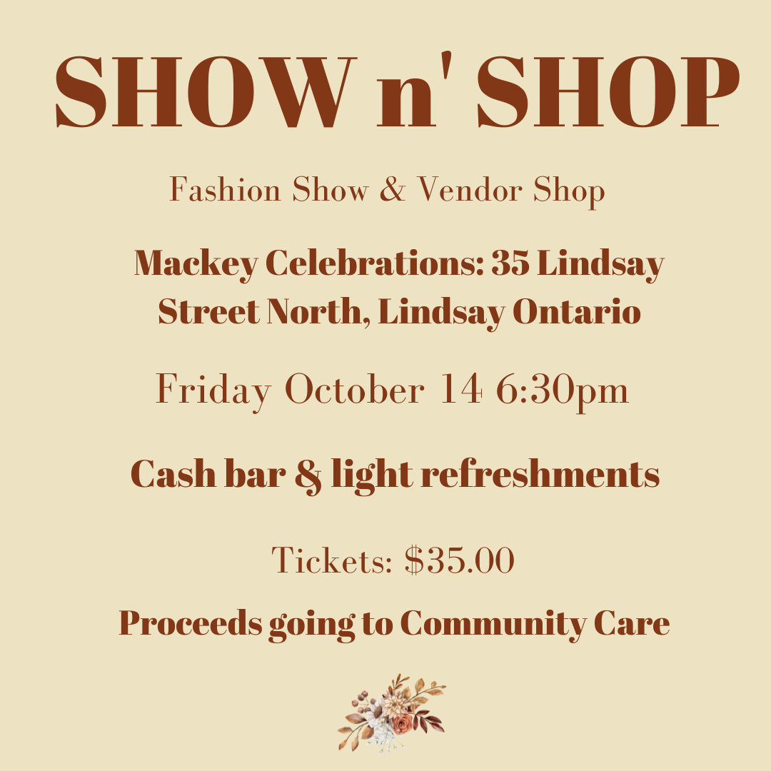 Save the Date! Our friends at Bonita Clothing & Co, are hosting a “Show n’ Shop” on Friday, October 14th! Enjoy an ultimate ladies night consisting of a fashion show from local clothing shops around the Kawartha Lakes and multiple vendors to browse! Enjoy light refreshments, catered by Milk and Honey Eatery while you shop and enjoy an evening out with friends. Proceeds from ticket sales and raffle go directly towards Community Care. Tickets can be purchased online or by visiting Britany n’ Bros, Unwrapped, Lingerie Loft or Cathy Allan in Lindsay! For more information, or to purchase tickets visit Bonita Clothing & Co’s event page here, or contact bonitaclothingandco@gmail.com today!