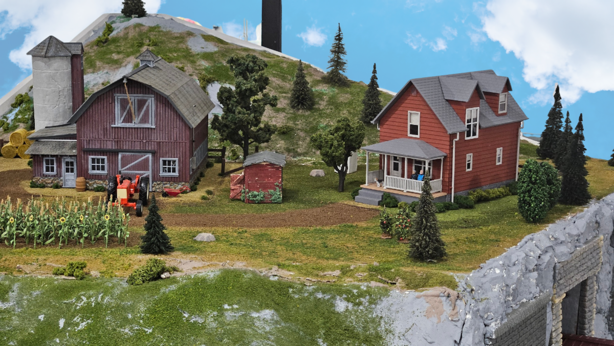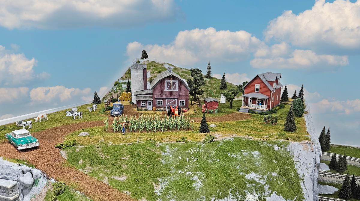 The barn, the farmhouse, and much of the surrounding scenery were donated by Ted Berry of Kinston, NC, a member of the Kinston Area Railroad Modelers Association.