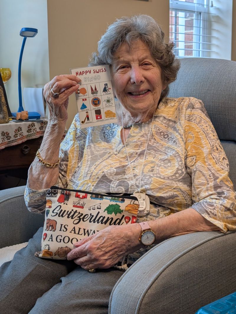 "Colette was thrilled to receive her bag. She plans to take her Swiss bingo to show the activity director."