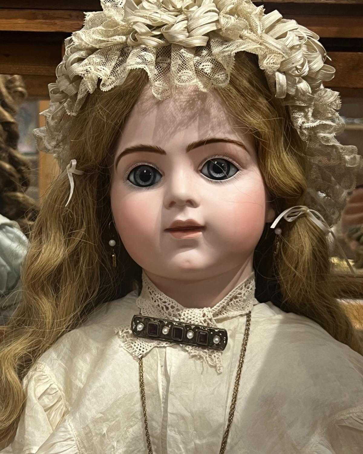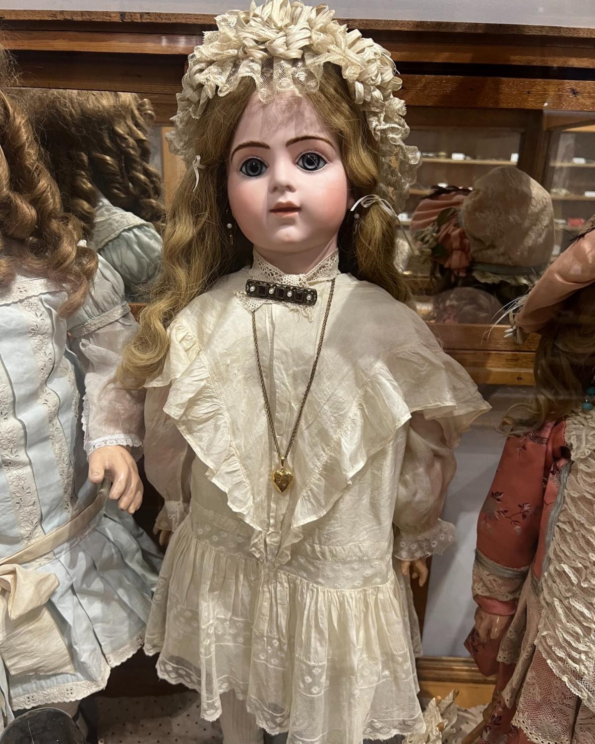 A STUNNING display of antique dolls, including Kestner, Steiner, Bru, Jumeau, China head, and Heinrich Handwerck head plus a beloved tiny doll in an egg-shaped case with wardrobe. From the collections of Nancy Williams Basham and her mother, Eleanor Edwards Williams.