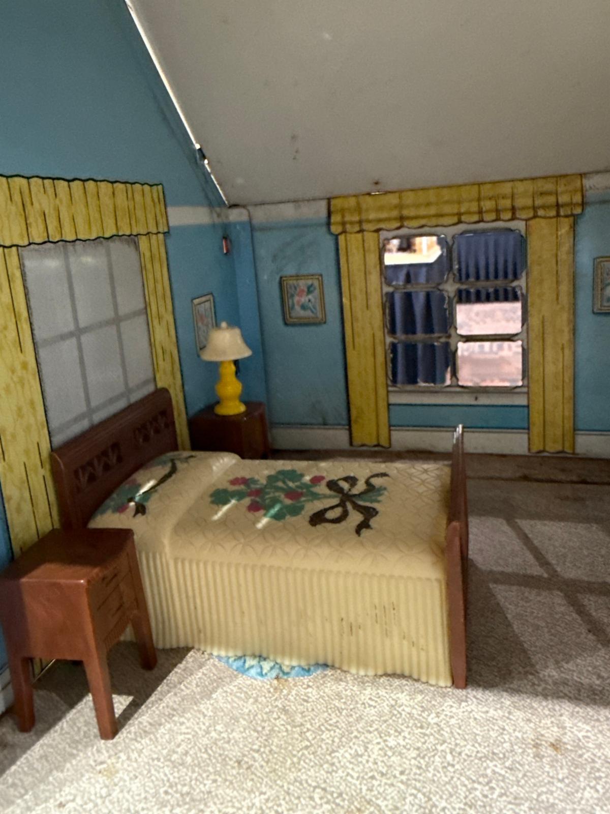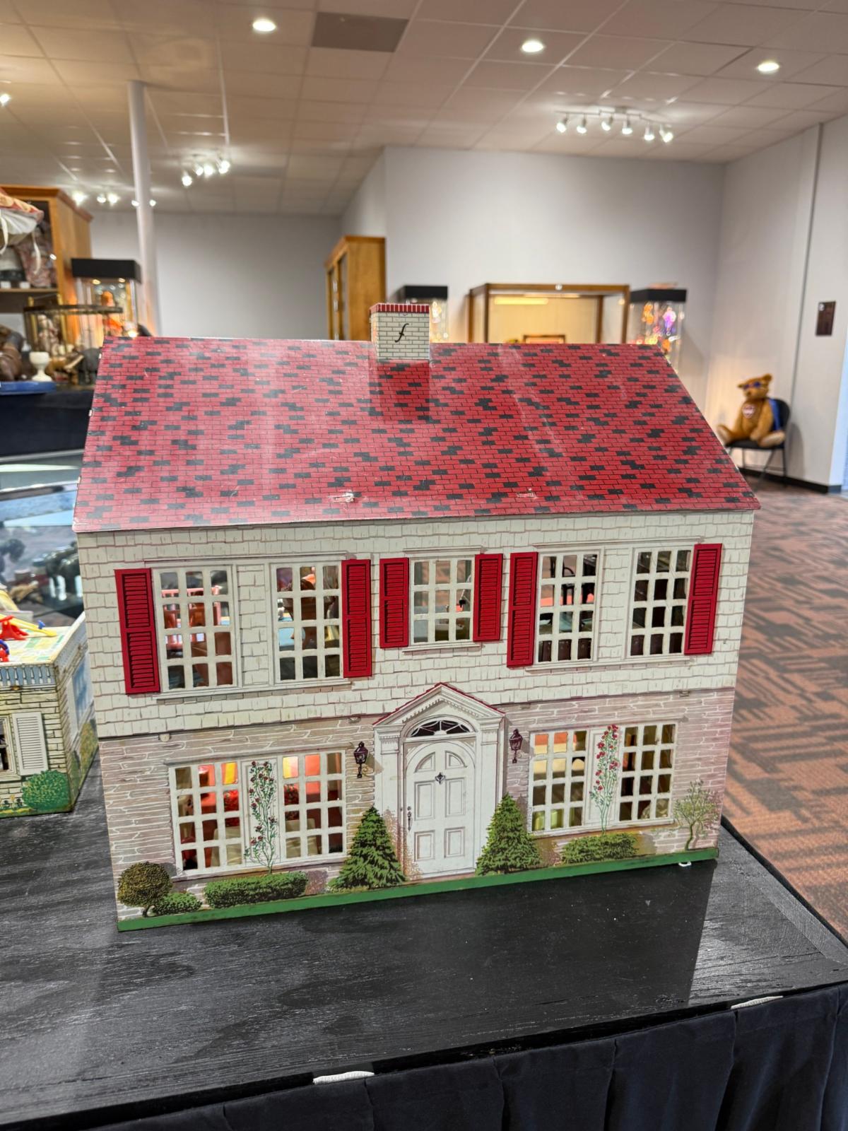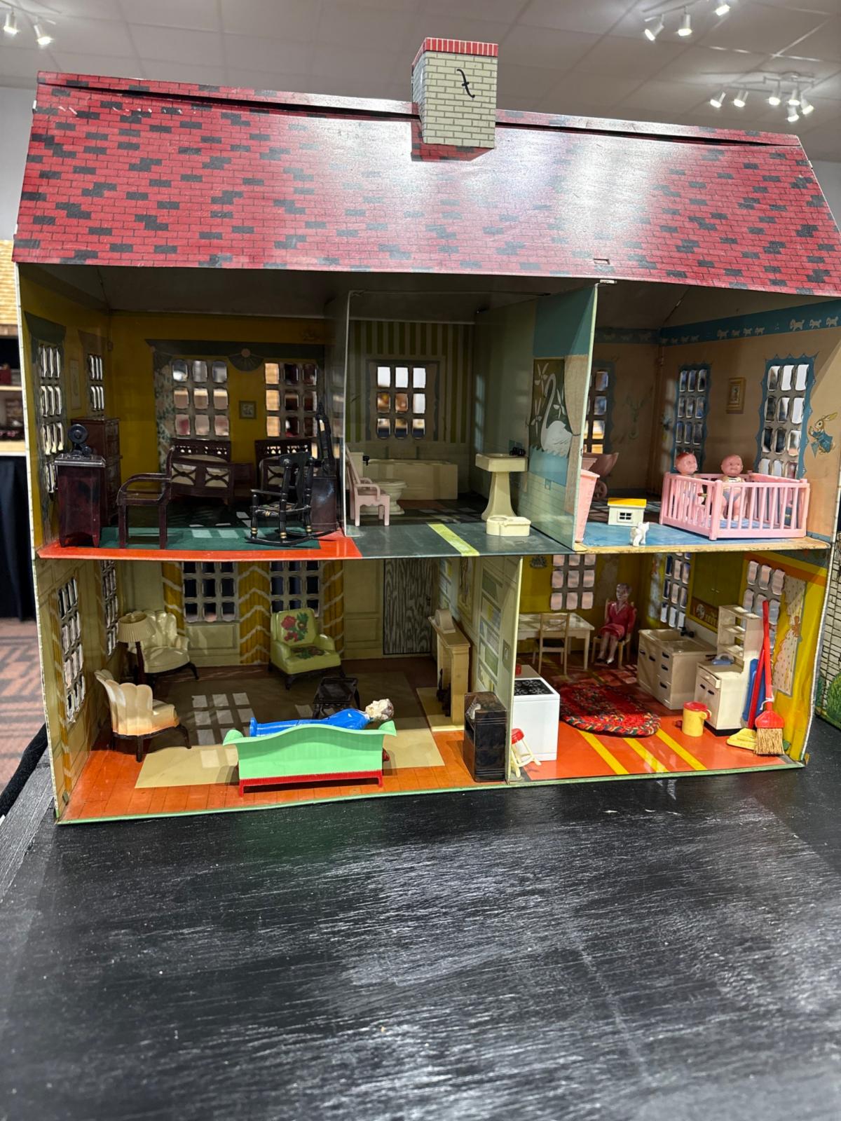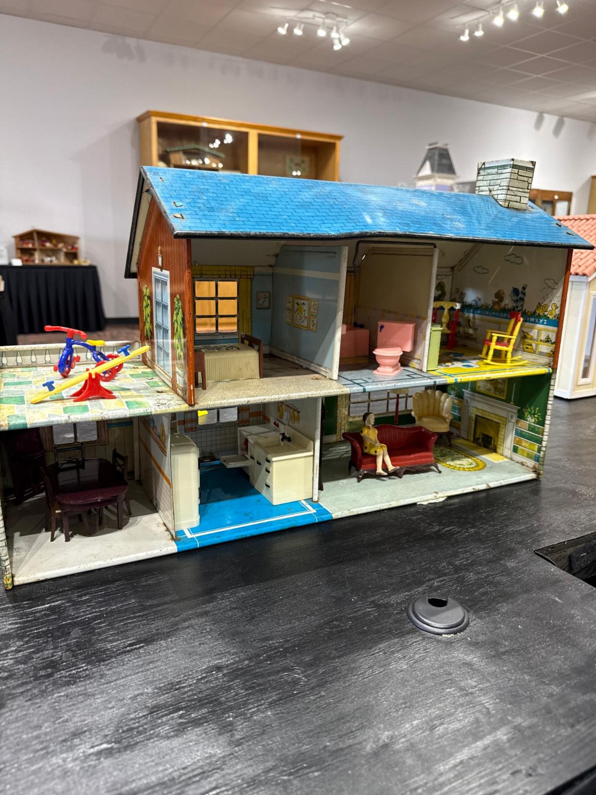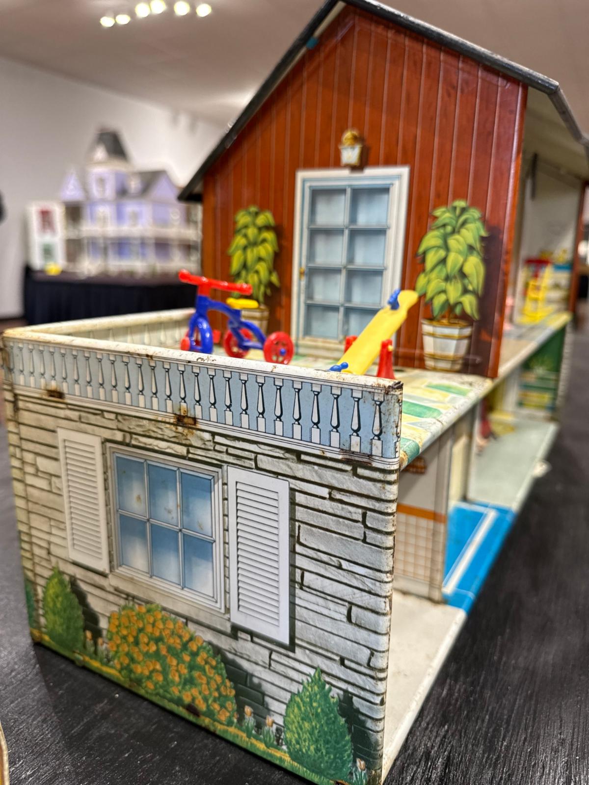 First, gems from our friends at the Kentucky Doll and Toy Museum - 1948 PLAYSTEEL Tin Litho Dollhouse - 2 displays: