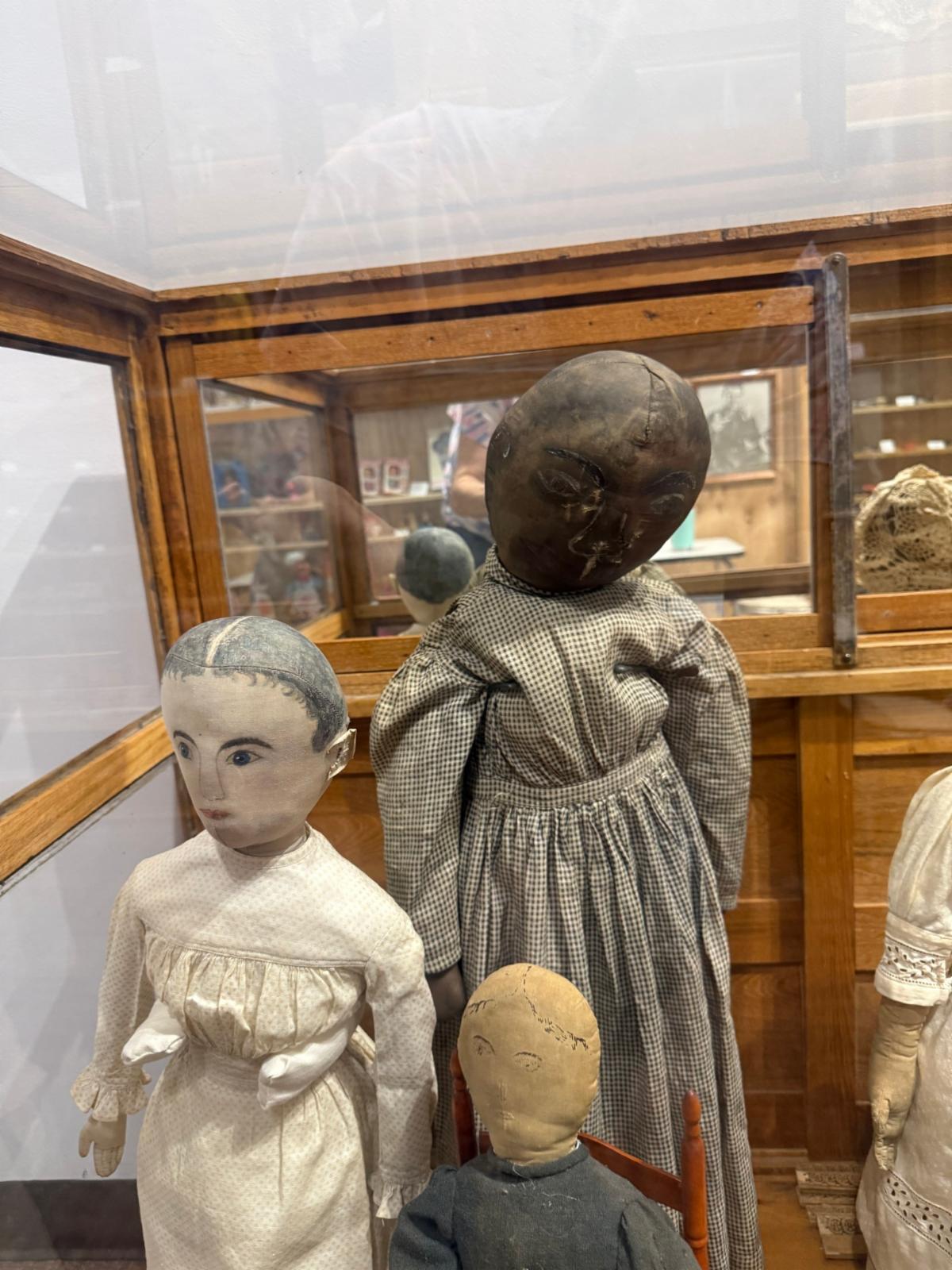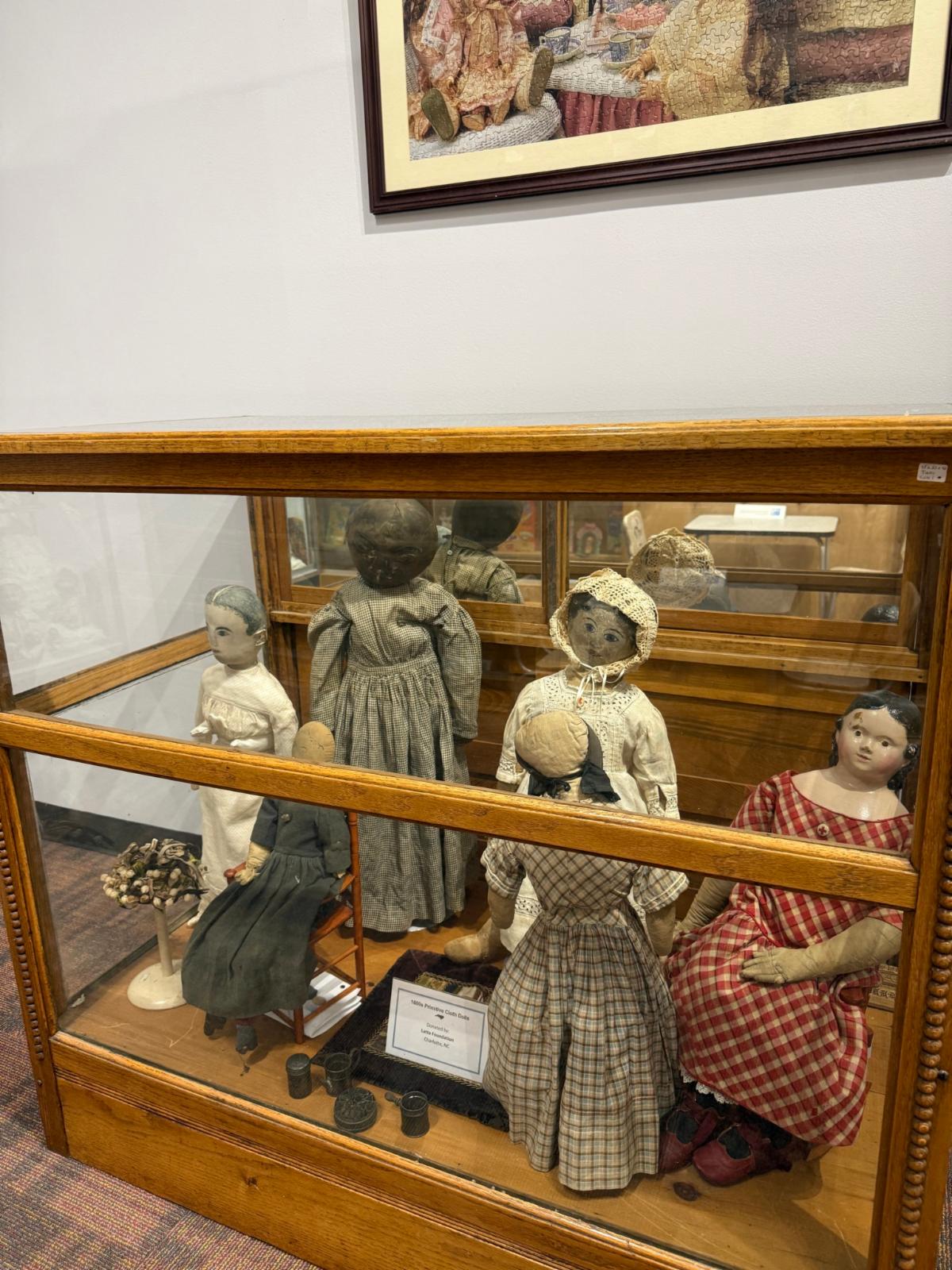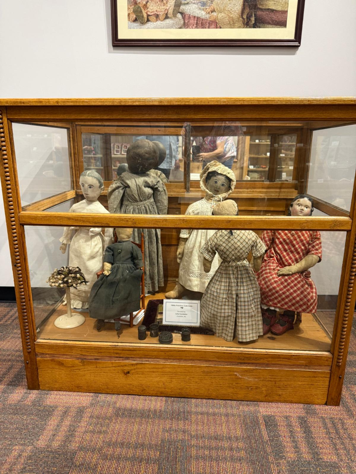 Take a look at these primitive dolls from the 1800s! The two large dolls in the back were donated by Latta Foundation, and the other dolls were donated by Martha Saban.