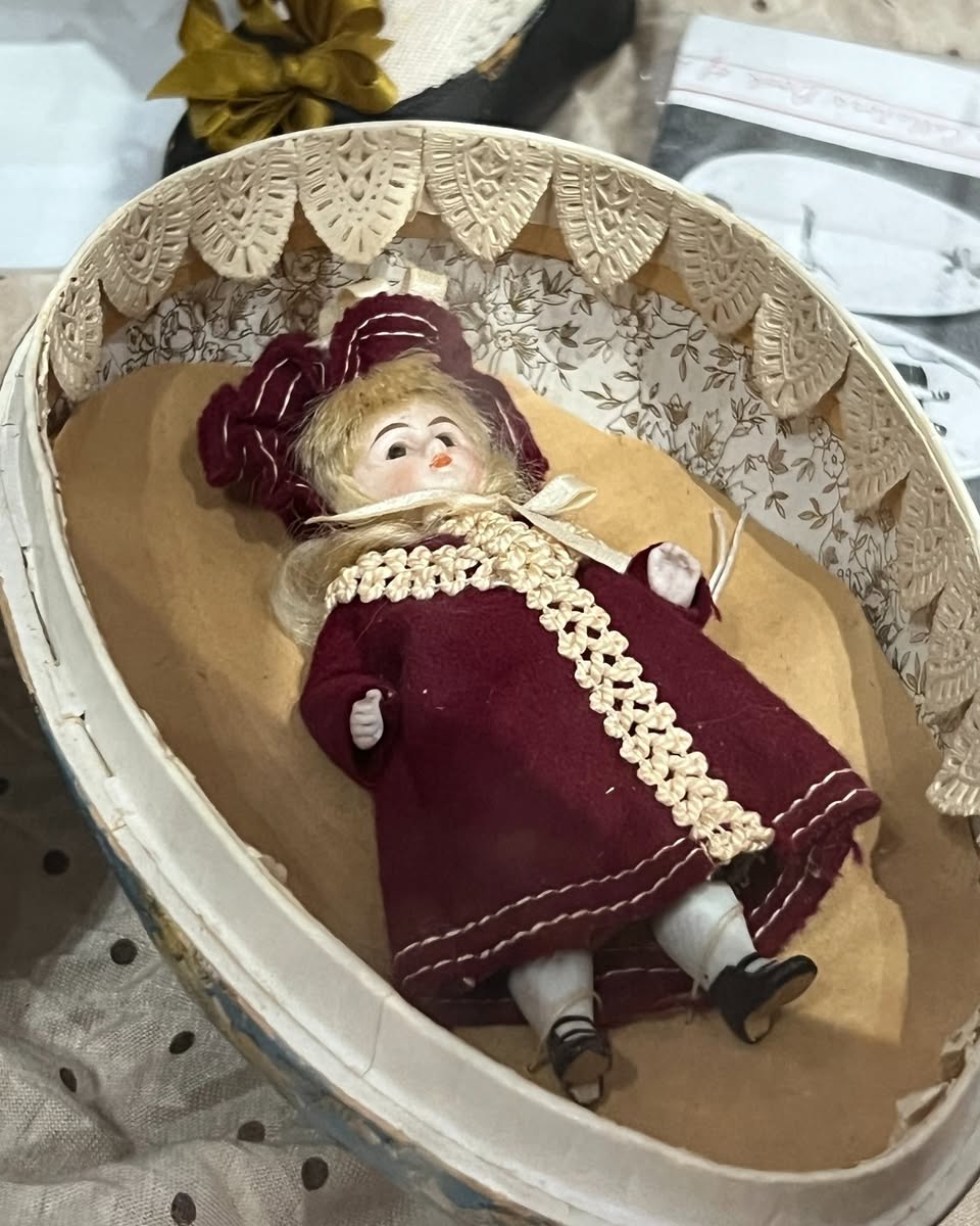 | | Small 12-inch German doll with bisque head and an open mouth with teeth. Unmarked maker. Belonged to Eleanor and was one of her favorites. It was passed to her daughter and become one of the inspirations for Nancy to begin collecting additional dolls: | Possible mignonette French doll. Tiny, nestled in a beautiful egg-shaped case with wardrobe: | And finally, an antique doll with a Heinrich Handwerck head. Large with a bisque head, sleep eyes, an open mouth with teeth, and a mohair wig: | |