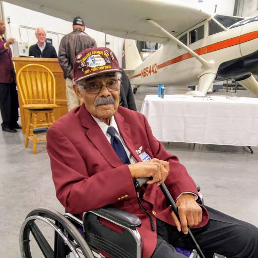 The late Frank Macon, Tuskegee Airman, lifelong aviator and Colorado Springs resident, is featured. Frank donated his prized Stinson V77 Reliant WWII-era aircraft to the Museum in 2019. The aircraft (seen in the background) has been repainted to its colors while in use by the government during World War II. Frank's commitment to service began with his participation in the Tuskegee experiment and continued with his extensive government service in Colorado Springs after the war.