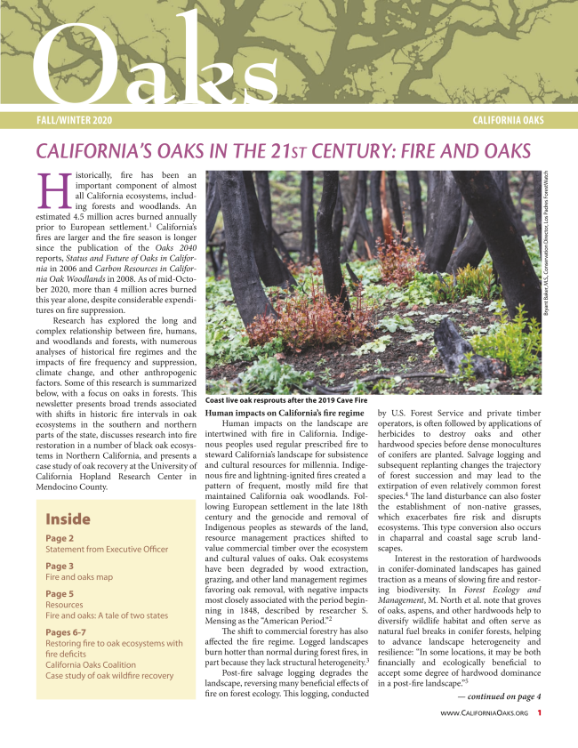 Read about fire and oaks in the Fall-Winter Oaks newsletter. Download a PDF of this publication, the first in a series of California’s Oaks in the 21st Century reports. The newsletter includes a map of California that overlays this century's wildfires of 100 acres or greater on oak woodlands and forests, information on research about oaks and fire in forested lands, research findings on restoration of fire in black oak ecosystems, and a case study about recovery of oaks after severe wildfire. The report provides other informational resources, and highlights members of California Oaks Coalition that have information about fire on their websites and/or conduct research on fire.