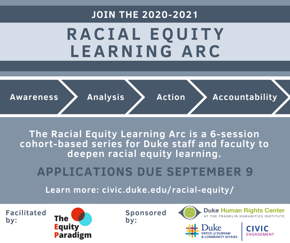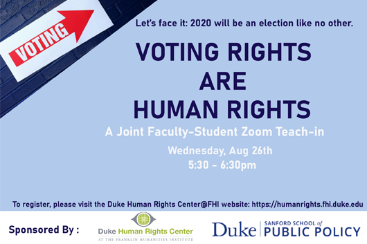 We want to invite everyone--wherever you are--to our first virtual event this semester. Join us tonight at 5:30PM for Voting Rights are Human Rights: A Faculty-Student Zoom Teach-In. It will be a chance to learn where to vote on campus and in Durham, how to volunteer at the polls and ask any questions you have. This event is free and open to the public, but we ask that you register in advance. DHRC faculty recently wrote a letter to The Chronicle asking Duke administration to protect voting rights that you can read here.