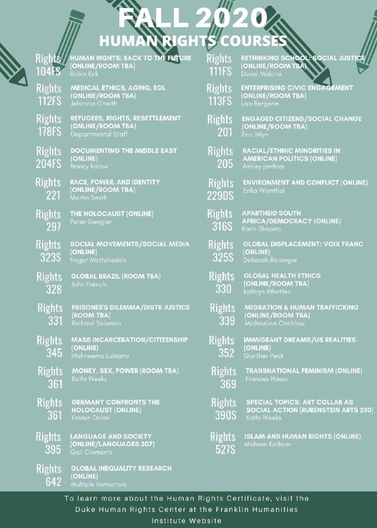 We are grateful to be in community with you and look forward to seeing you at events and in class, communicating through newsletters and one-on-one Zoom meetings, and collaborating on human rights opportunities. Please be in touch if you want to learn more about the Human Rights Certificate or get involved with the Duke Human Rights Center@FHI.