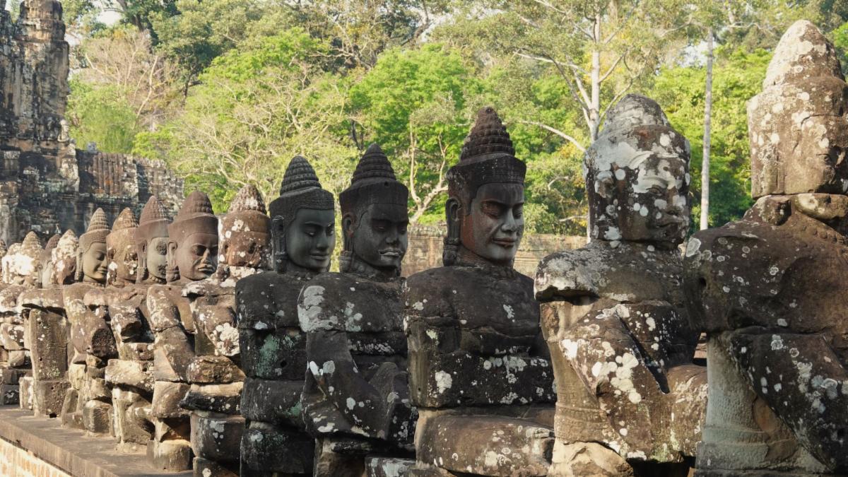 (Photo credits: Angkor Wat statues by guide Phil Gregory, and Green Peafowl, Proboscis Monkey, and Great Hornbill by participants Myles McNally, Matt Denoncour, and Ephraim Heller.)