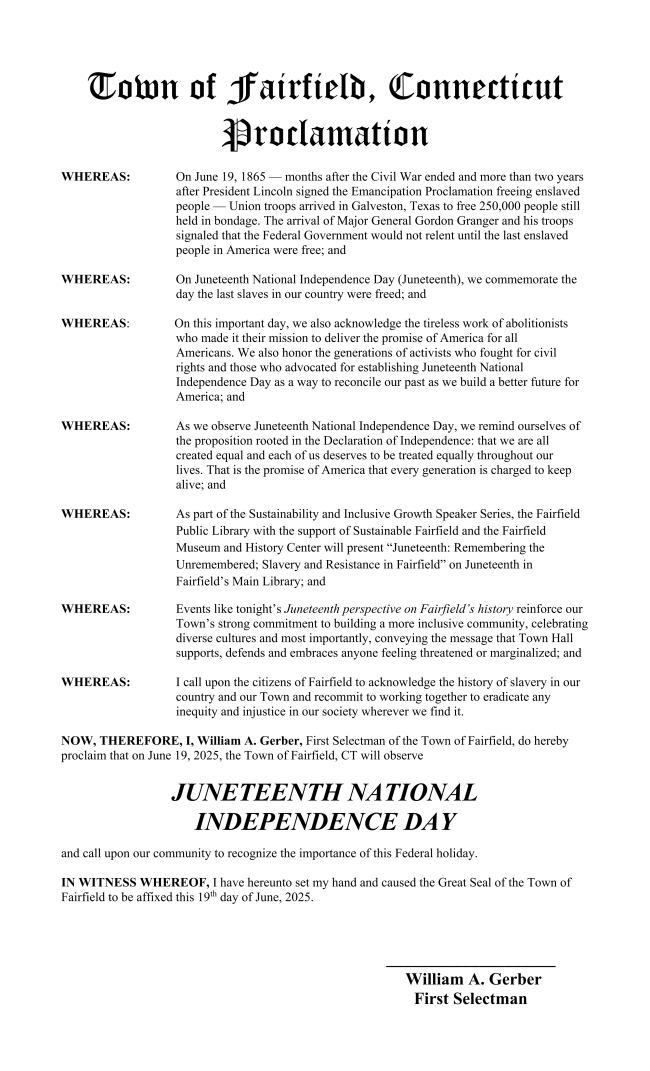 On Juneteenth, we reflect on our shared history and recommit ourselves to making Fairfield a Town where everyone is respected, valued and free.