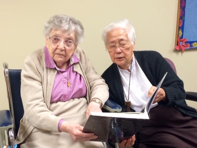 For this activity, we decided to do some "hands-on history." Yearbooks from the past 30 years at St. John the Baptist were brought in, and the sisters had a great time seeing how many Alleganies they could find in their pages. Our sister teachers also reminisced about their years teaching at schools all over the world. Pictured here are Sisters Anne Clare and Joan Clare, reviewing a yearbook together.