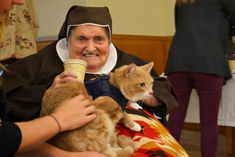 On October 2, 2015, the St. Elizabeth Motherhouse held a Blessing of the Animals. Several staff members, partners in ministry, and sisters brought their furry companions to be blessed. Motherhouse Sisters came to the event and enjoyed some time with the animals. Pictured is Sr. Concilia Flaherty and Carmelo, owned by Activities Director Monica Colts.