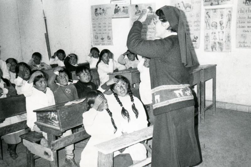Pictured: Alto La Paz, around 1972. Sister Maria Miranda teaches Religious Education to a class of Bolivian children.