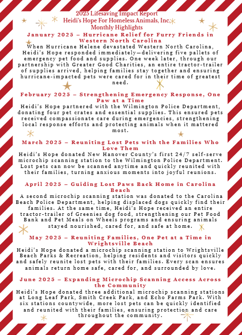 | | | Heidi’s Hope for Homeless Animals, Inc. is a 501 ( c ) organization that is an intake organization who helps pets at risk of euthanasia and helps prevent owner surrender. The Bow Wow Luau & The Cat’s Meow® has donated over $80,000.00 to reduce shelter euthanasia. We’re proud to be Cape Fear’s first-ever Pet Food Bank and the creator of the region’s very first Pet Meals On Wheels Program—filling a critical void in our community and leading the way in providing essential food support for pets in need. Thanks to the generosity of our supporters, Heidi’s Hope for Homeless Animals’ Pet Food Bank and food programs have donated over 310,533 pounds of pet food, valued at more than $866,142, to help feed hungry pets in desperate need. Together, we’re not just filling bowls—we’re giving hope. We created a unique coalition of local governmental agencies and human charitable organizations to provide pet food to the most food insecure. We expanded our Pet Food Bank and Pet Meals On Wheels Chapters in Onslow, Pender and Brunswick Counties. WoofStock, adopts at-risk dogs and cats. Our Disaster Relief Programs filled three tractor trailers with pet food to hurricane-impacted areas from Hurricanes Maria; Florence and Dorian. We sent two tractor trailers of pet food to western North Carolina in the aftermath of Hurricane Helene. We sent two crates of pet food to help Hurricane Ian pet victims. We sent five pallets of pet food to war-torn Ukraine. We have donated microchip scanning stations to both the Wilmington Police Department; Carolina Beach Police Department; Wrightsville Beach Police Department; New Hanover County Parks, including Long Leaf Park; Smith Creek Park and Echo Farms Park. Heidi’s Hope For Homeless Animals is committed to saving the lives of homeless dogs and cats and will not stop until all dogs and cats have good homes! | | | | |
