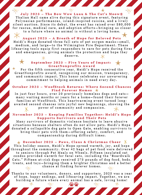 As the year comes to a close, our hearts overflow with gratitude for every donor, volunteer, and supporter who made these moments possible. Your kindness fills bowls, warms whiskers, and delivers hope—one paw at a time. From all of us at Heidi’s Hope, Merry Christmas and Happy Paw-i-Days!