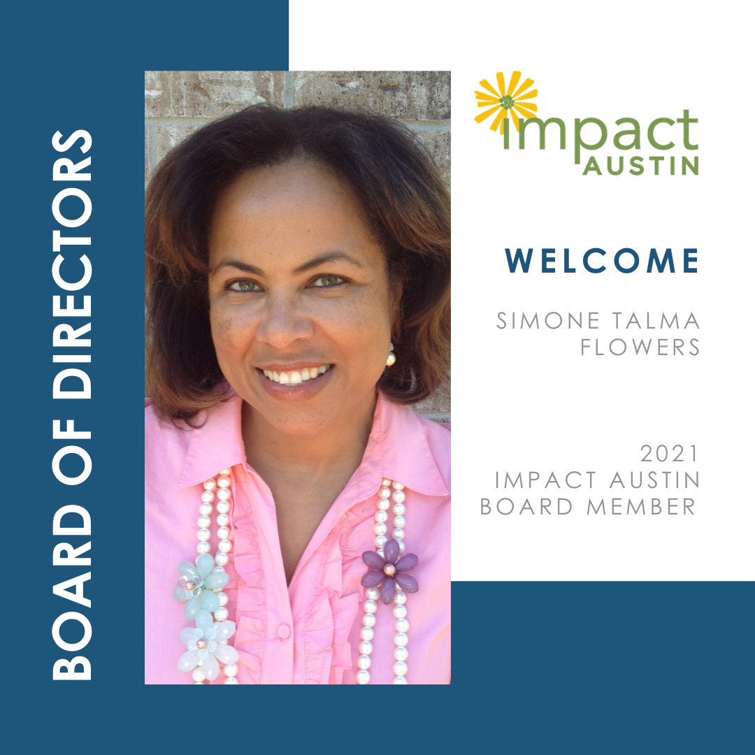 Impact Austin member and Executive Director of Interfaith Acion of Central Texas (iACT), Simone Talma Flowers joined Impact Austin’s Board of Directors on January 1. Passionate about diversity and inclusion, she believes everyone—regardless of age, gender, religion and culture—should have access to opportunities, so they can live up to their fullest potential. Simone has a Bachelor of Arts in Psychology and a Master of Business Administration from St. Edward’s University, with over 27 years of extensive experience in nonprofit management. She is the recipient of the Gulen Peace Award from the Dialogue Institute of Austin, the Outstanding Alumni Award from Leadership Austin, and the Anne Durrum Robinson Creative Initiative Award from Women Communicators of Austin. Welcome to the Board, Simone!