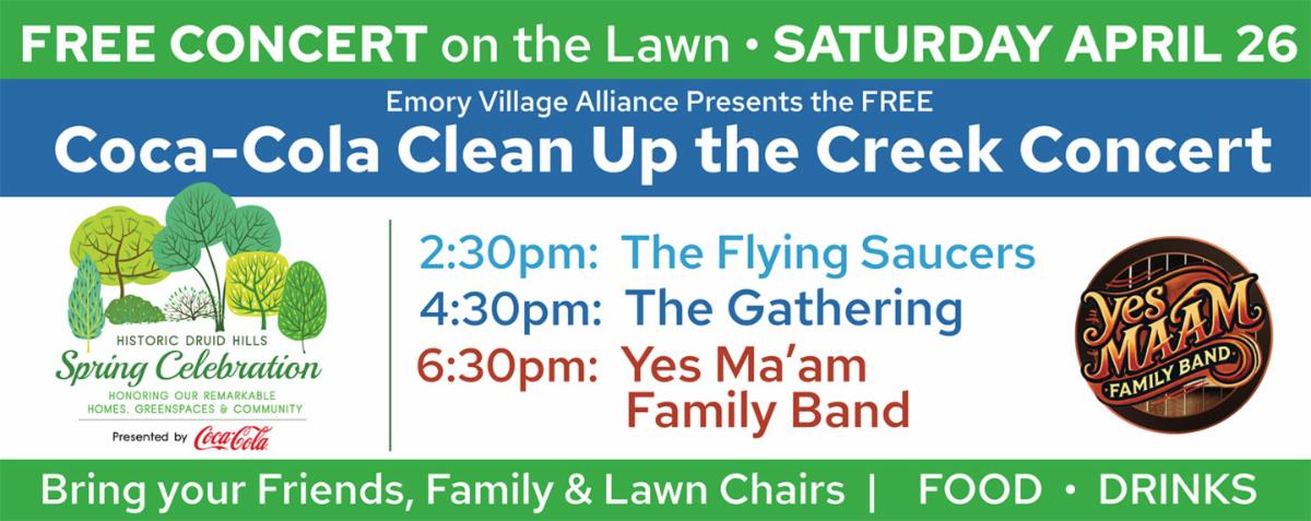Emory Village Alliance is proud to present the Coca-Cola Clean Up the Creek Concert on Saturday, April 26, on the Emory Village lawn on the corner of North Decatur and South Oxford roads.