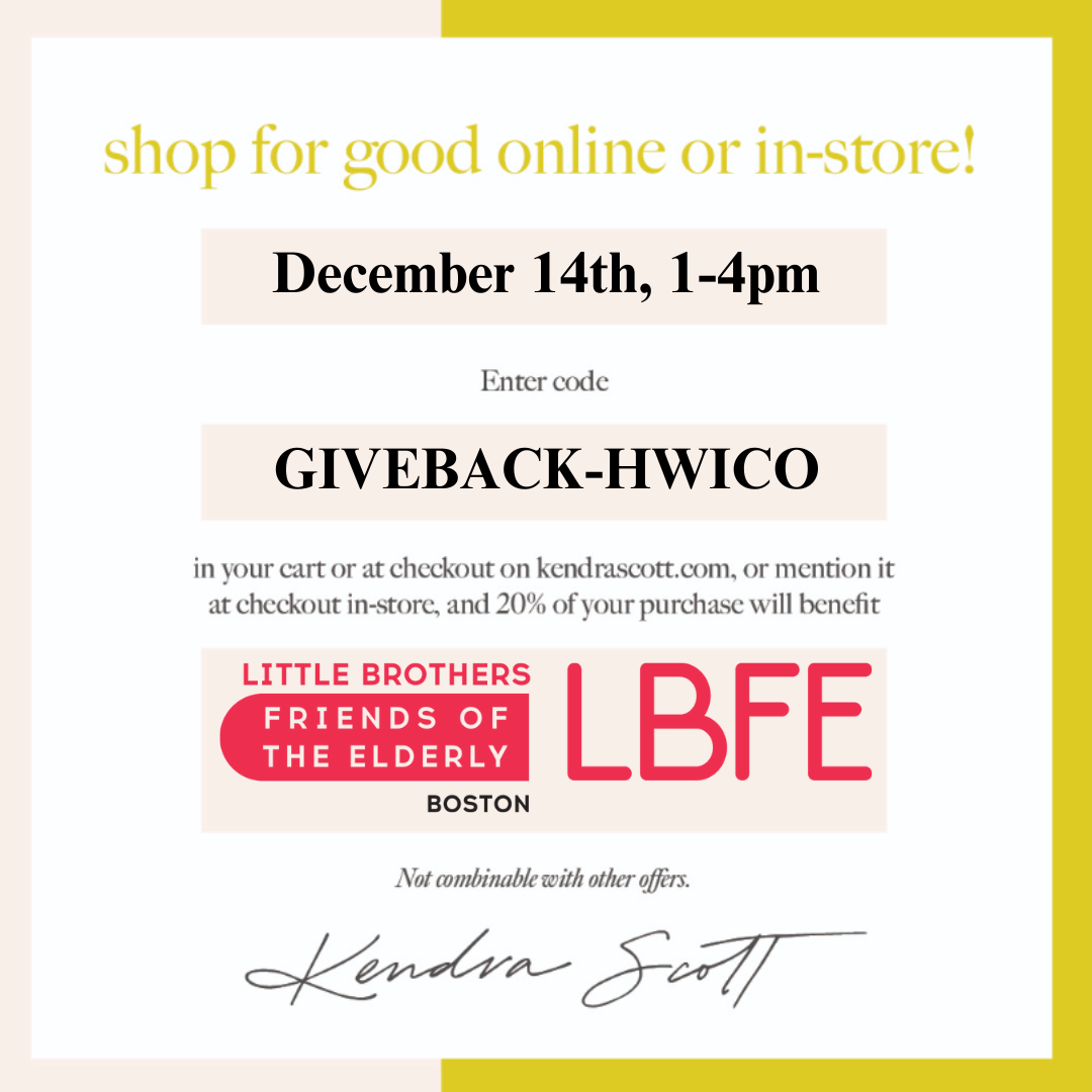 Join us on Saturday, December 14th at the Kendra Scott store at MarketStreet Lynnfield from 1-4 pm for our annual Give Back Event! Can't make it in person? No problem! Use the code GIVEBACK-HWICO at kendrascott.com for all your online purchases between Friday, 12/13 and Sunday, 12/15. 20% of your total purchase goes back to LBFE Boston to support our programming! RSVP to Zack by Thursday 12/12 if you plan to join us in person. Thank you!