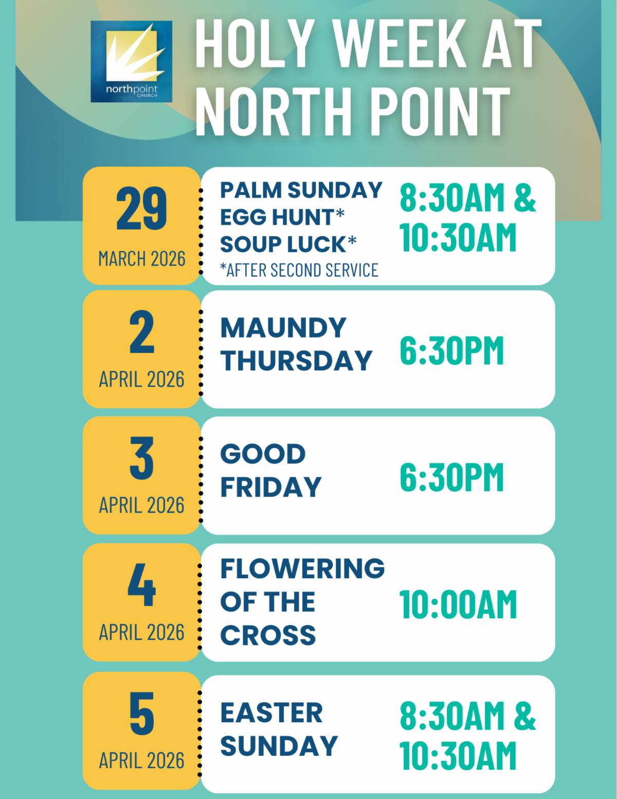 Ash Wednesday marks the beginning of Lent—a season of reflection, confession, repentance, and spiritual preparation for Easter. This year, in addition to our 6:30pm Ash Wednesday service, North Point will offer a “drive‑thru” imposition of ashes from 11am to 2pm, allowing you to receive this meaningful blessing without leaving your car. If you’re unable to join us in the evening, we warmly encourage you to come by during the day and begin the Lenten journey with us. If you are interested in volunteering to administer ashes from 11am to 2pm, please email anna@np-church.org.