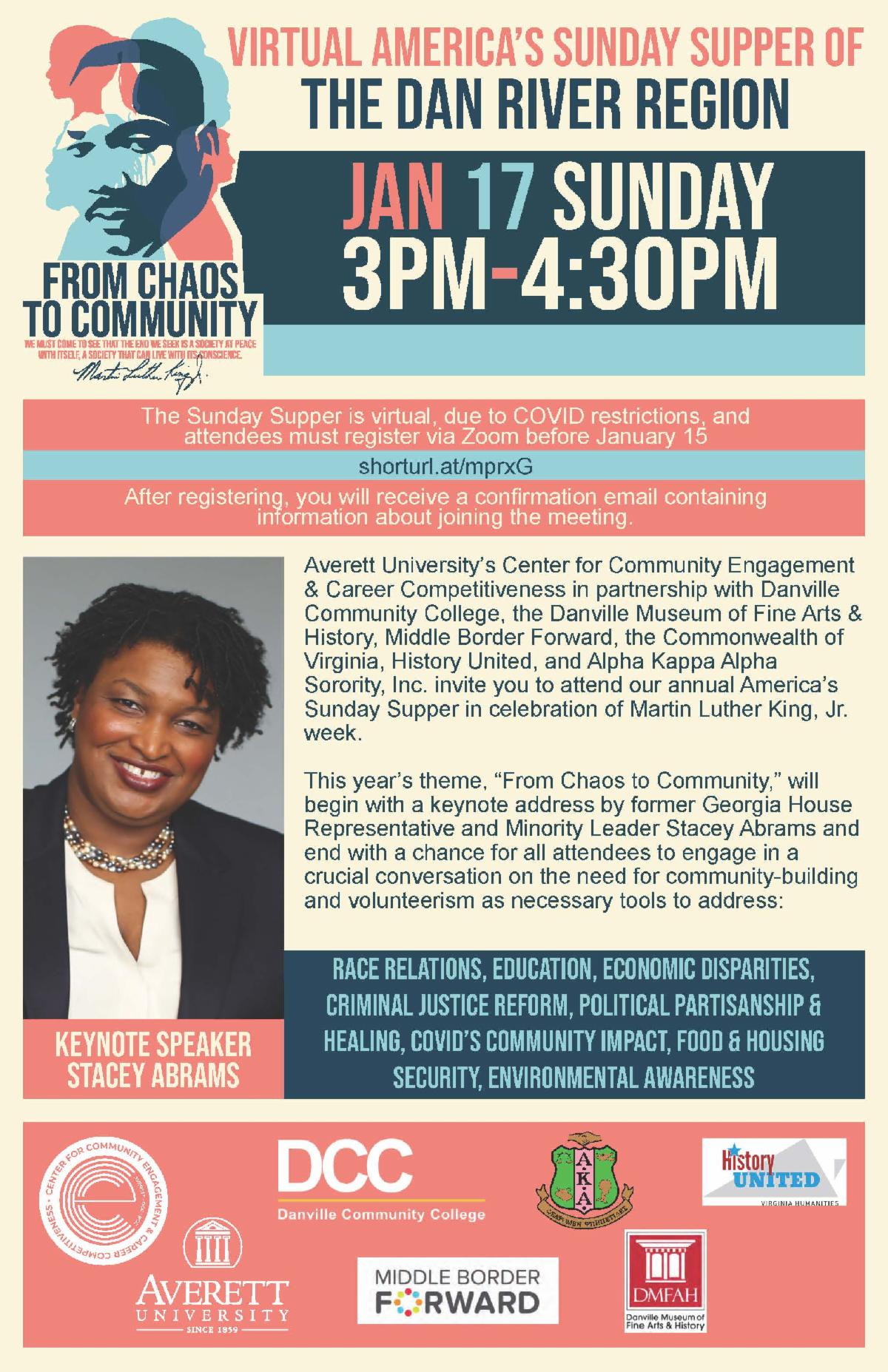 Averett University’s Center for Community Engagement and Career Competitiveness [CCECC] invites you to attend their annual America’s Sunday Supper in celebration of Martin Luther King, Jr. Week on January 17 from 3-4:30 p.m. via Zoom. This year’s theme, “From Chaos to Community,” will begin with a keynote address by former Georgia House Representative and Minority Leader Stacey Abrams and end with a chance for all attendees to engage in a crucial conversation on the need for community-building and volunteerism as necessary tools to address many of our social problems.