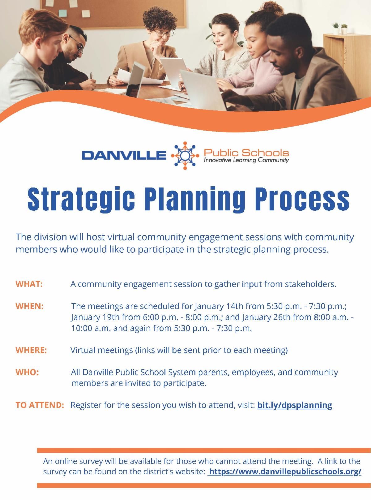 A new strategic planning process for Danville Public Schools is currently underway. The process will chart the course of the division over the next five years. In addition to teacher and community surveys, the division will host virtual community engagement sessions with community members who would like to participate in the strategic planning process. Register below if you would like to participate. A meeting link will be emailed to you prior to your selected meeting date.