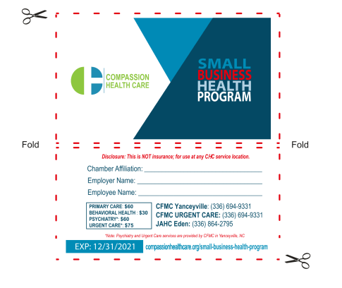 This program provides discounted access to health care services provided by any Compassion Health Care, Inc. location, including our Yanceyville and Eden locations. As a partnering Chamber member, you are eligible for discounts through this small business health program.